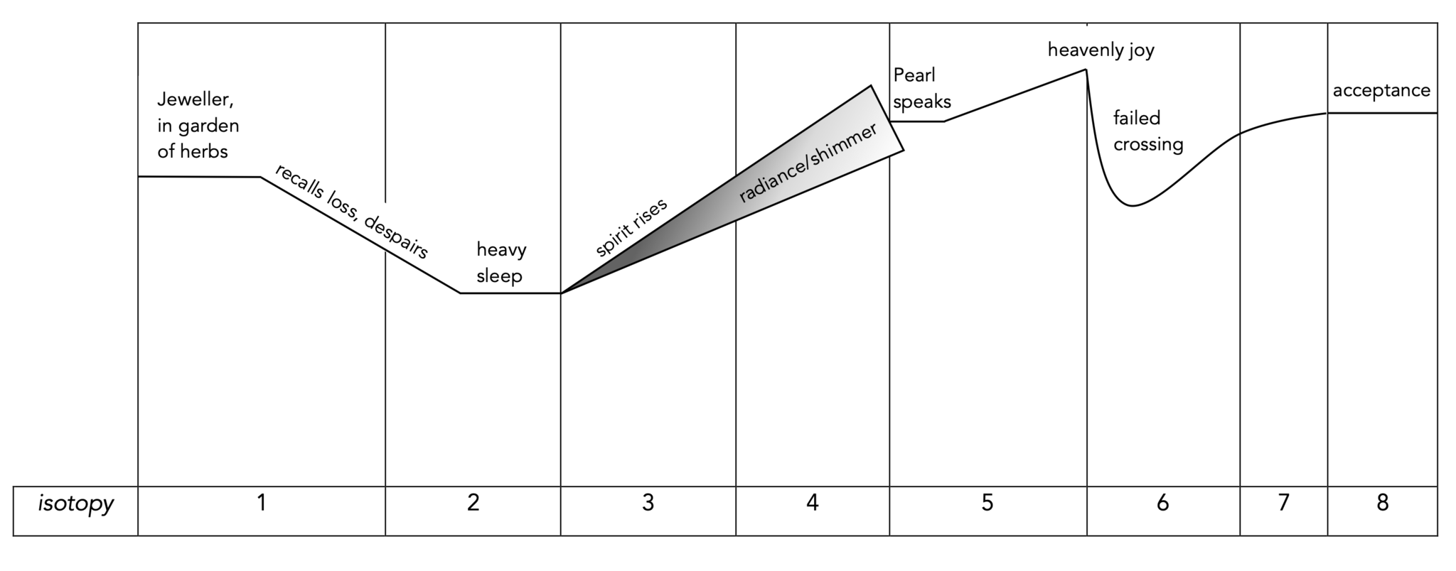 Lastly, in Figure 9, I summarize this entire narrative structure visually to clarify and convey its overall trajectory to highlight the integration of its main images at the larger level of form. Significantly, in contrast with the arc-like or triangular contour of most comparable graphs (usually based on Freytag’s (1876) famous ‘narrative pyramid’ characterized by ‘rising action’ approaching a climax) mine has perhaps a more distinctive trajectory (cf. Hoffman 2002: 116 and Scheuregger 2021: 304). Arguably this functions on multiple levels: in a more literal sense, it conveys my reading of the poem and the fall and rise in status (or rank, to use Almén’s term) of the Jeweller-protagonist as he sinks deeper into his grief, falls asleep and undergoes his dream-quest, leading to his radiant vision of Pearl and her joyous existence, his brief loss of rank in his failed attempt to cross the river, and final ascent to state of equanimity with his grief through his renewed faith. Yet in another, it depicts the harmonic underpinning of the work as depicted in Figure 8 and Table 2: the literal descent of the orchestra in isotopy 2; the ensuing climatic build-up; and the eventual attainment of harmonic equilibrium; thereby highlighting the close mirroring between the poetic and musical narrative in the work.
