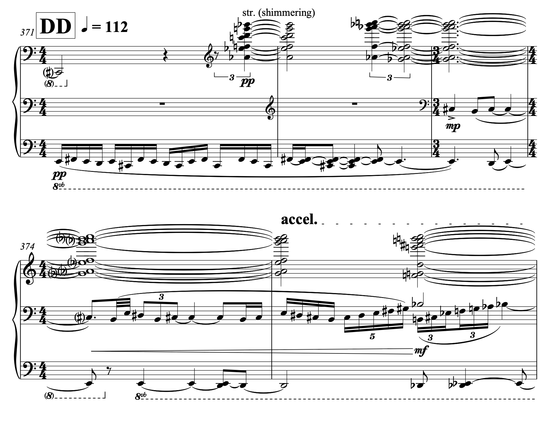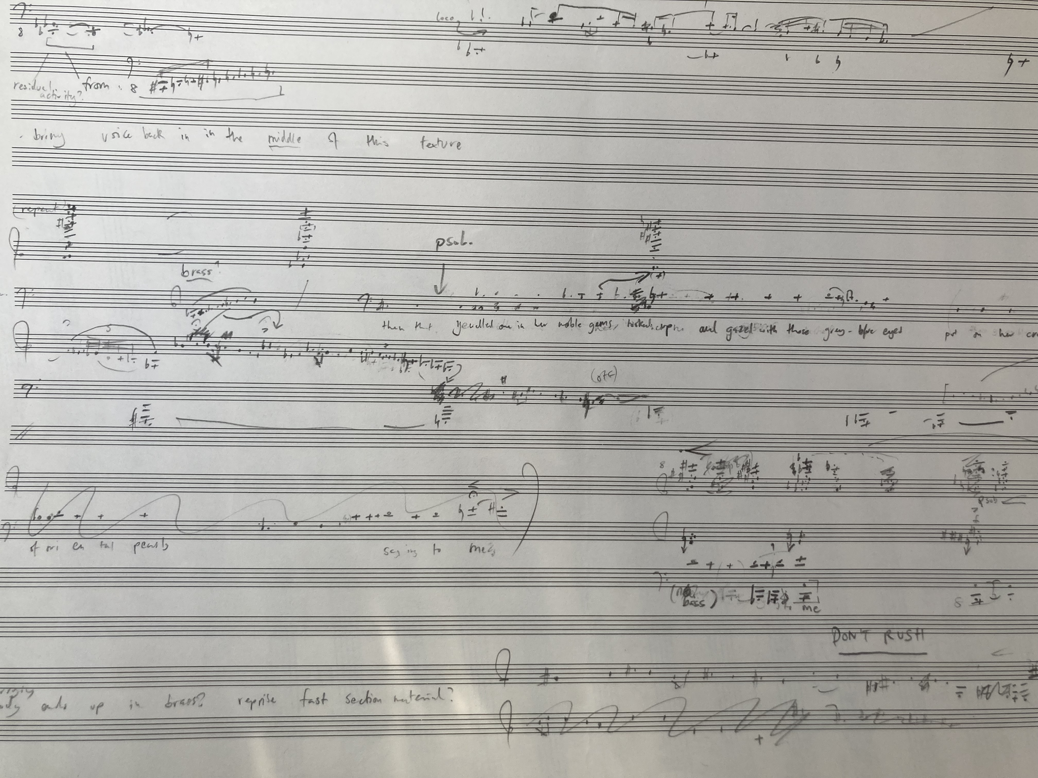 Instead, as noted, the creative journey in this work was characterized, apart from a few more intense bursts of activity in its early stages, by a slow realization that the whole piece needed to be complete in a provisional state before the large-scale structural concerns could truly be solved. As I wrote in my diary in November 2019: