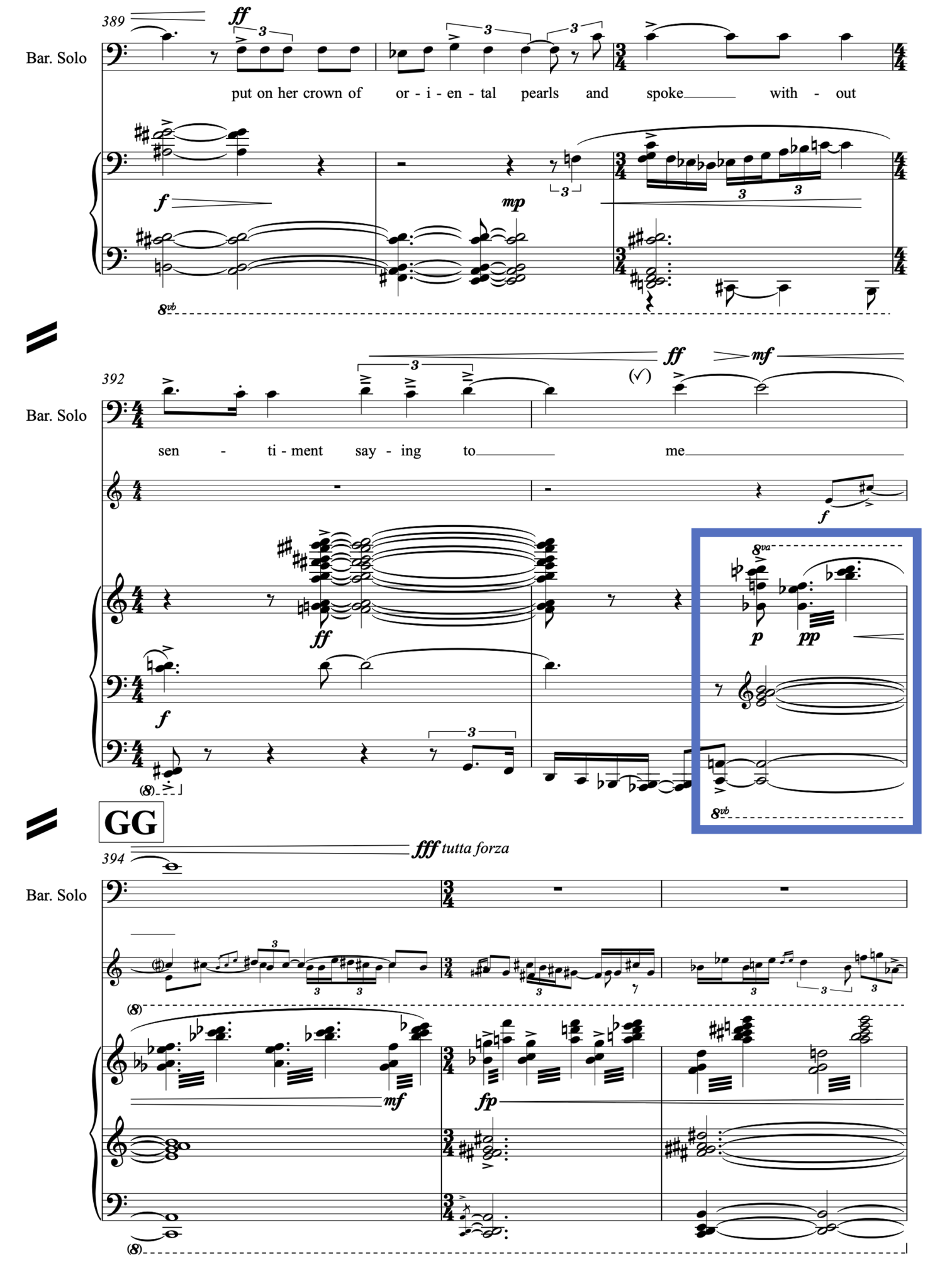 Indeed, the sheer number of iterations of this harmonic progression in my sketches (a selection are shown in Slideshow 1) speaks to the degree of fine-tuning required to satisfy the complex harmonic and voice-leading demands of the passage (the ‘maximal shimmer’ chord occupies nearly the full tessitura of the orchestra from the double basses low C to a very top A-flat), not to mention the narrative weight of this highly dramatic and uncanny moment in the poem, which had profound (or, given the profile of the premiere, somewhat terrifying) implications for ‘getting it wrong’.