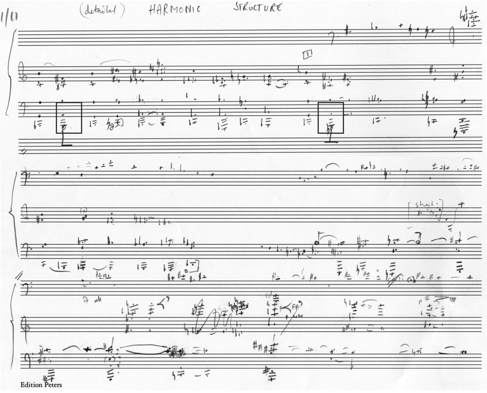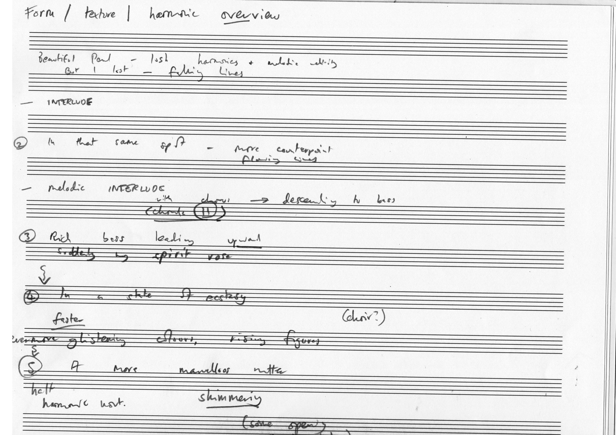 Looking back now, though this structural sketch was simply abandoned after one page (taking it only as far as bar 66), I suspect it nevertheless represents an early step in my journey towards the final harmonic structure of the work.