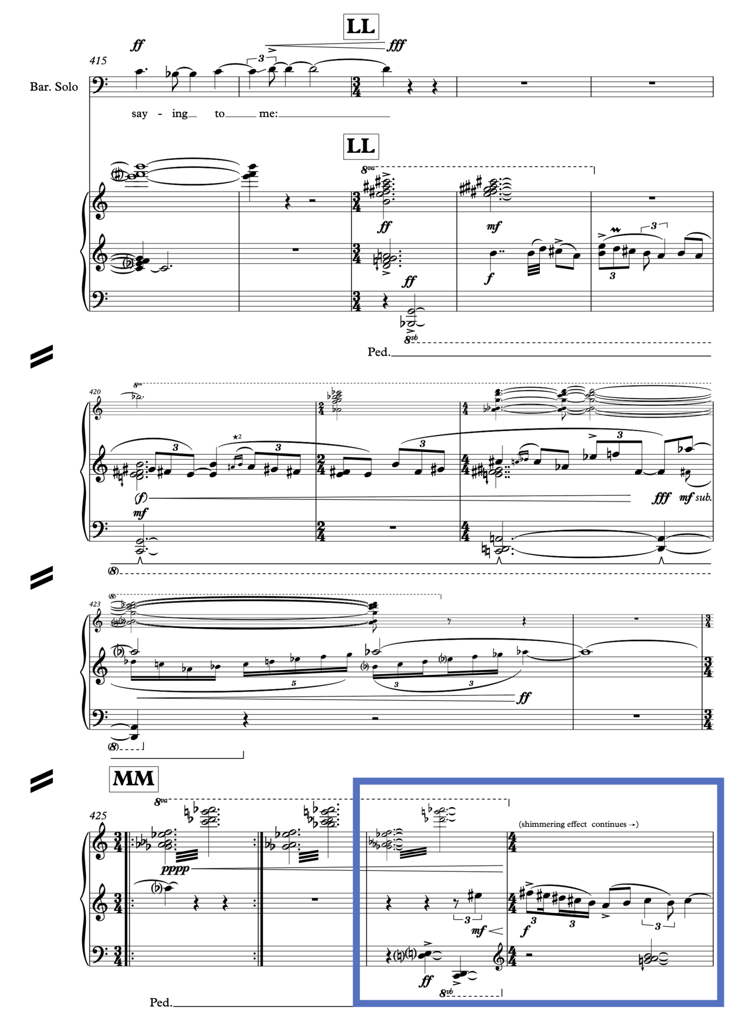 Perhaps most disconcertingly for me, the precise chord progression leading to the moment of ‘maximal shimmer’ ([LL] to [MM] in Figure 13d) underwent many revisions, right until the very day before the submission of the vocal score in February 2022. With hindsight, I believe this was because I had not fully understood its role as ‘pre-climactic’. (An understanding that I perhaps only fully reached, and/or accepted, when revisiting the work and analysing it for this paper.)