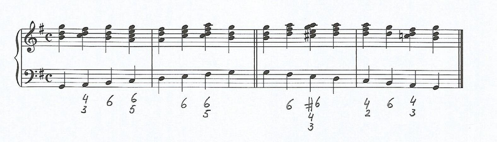 This exercise leads to what is known as ‘the rule of the octave’. In the book ‘The rules of music – for beginning keyboard players by Vincenzo Mazzola-Vocola’ – written in Naples in 1775 this 'rule of the octave' is explained clearly. In short, it explains how our ‘classical trained ears’ for the music until ca 1870 experience the following chords to sound ‘natural’ on the scale degrees of a bass line moving up and down a scale: