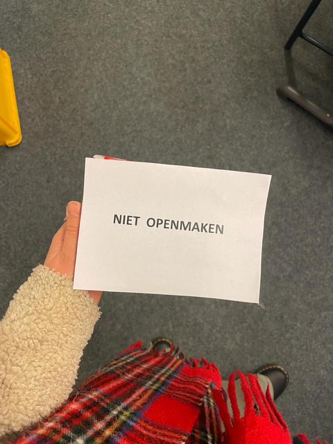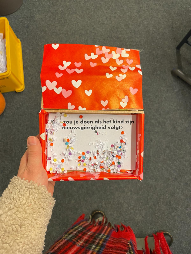 Samen kwamen we op het idee om het doosje: ‘Niet openen’ in de koffiekamer te zetten. De vraag is natuurlijk of de leerkrachten hun nieuwsgierigheid volgen of zich toch houden aan hetgeen wat er staat. In het doosje zit een kaartje. Op dit kaartje staat: ‘Wat zou jij doen wanneer een kind zijn of haar nieuwsgierigheid volgt?’. In de hoop dat dit natuurlijk de leerkrachten weer aan het denken zet.