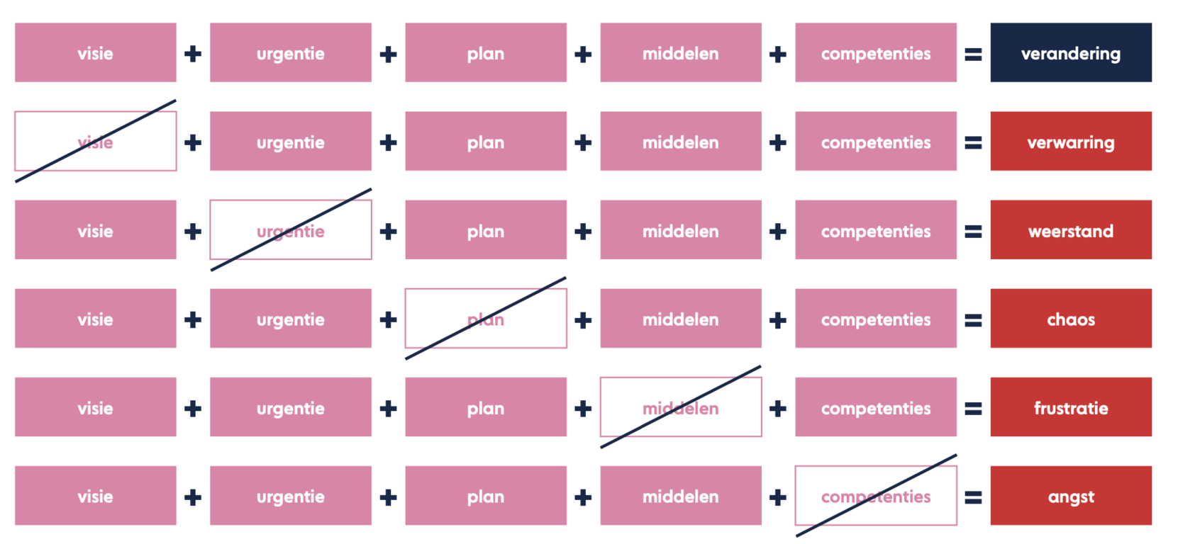 Uit de gesprekken die ik heb gevoerd na alle interventies die ik heb gedaan blijkt dat ik opnieuw naar het verandermodel van Knoster (1991) zal moeten kijken. Op welk element, welke succesfactor, gaat het nu mis? Wellicht is dit namelijk een term die buiten de theorie van Drive (Pink, 2010) valt. Er is veel overlap in het model van Knoster (1991) en de theorie van Drive. Toch wil ik, gezien het om een verandering gaat binnen een organisatie, het verandermodel van Knoster ernaast leggen. Daarna kan ik opnieuw herzien of er de overlap is met de theorie van Drive (2010).