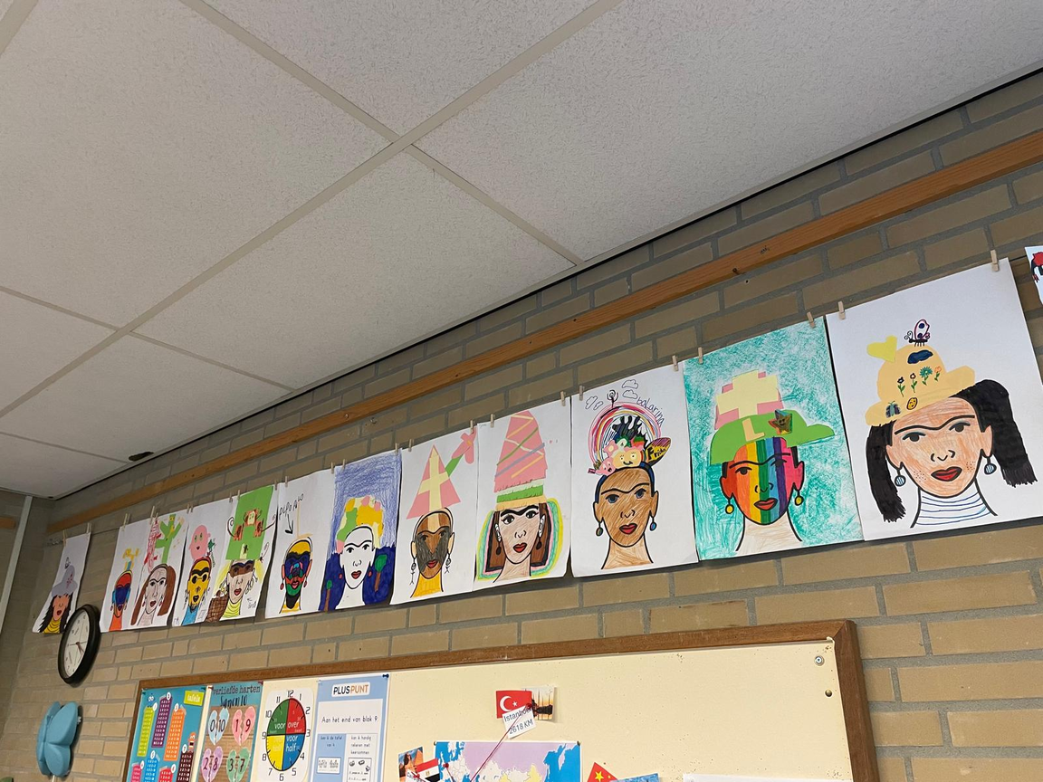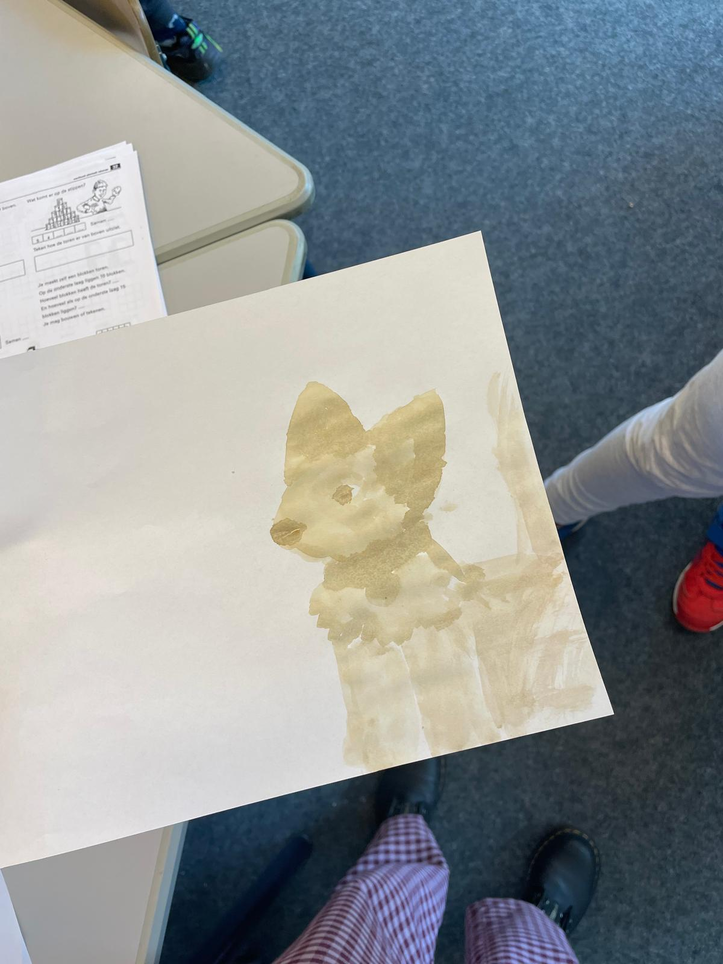 Toen de tekeningen allemaal lagen en iedereen op zijn plek zat, vroeg ik: 'Lieve groep 4B, wie heeft er zijn naam op zijn kunstwerkje gezet?'