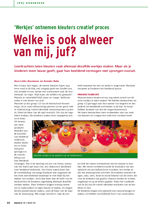 Tot mijn verbazing waren de lessen van Rita echt ondermaats. Alles wat ik gelezen en geleerd heb over hoe een kunstles moet zijn, was dit niet. Er werden alleen maar gesloten vragen gesteld aan de kinderen, de kinderen mochten niet reageren en de fantasie van het kind bleef achterwege, omdat het toch echt een 'vliegmobiel' moest zijn. Op het laatste van de powerpoint liet juf Rita de laatste dia staan. De laatste dia met voorbeelden van kinderen die al eerder een vliegmobiel van klei hadden gemaakt.