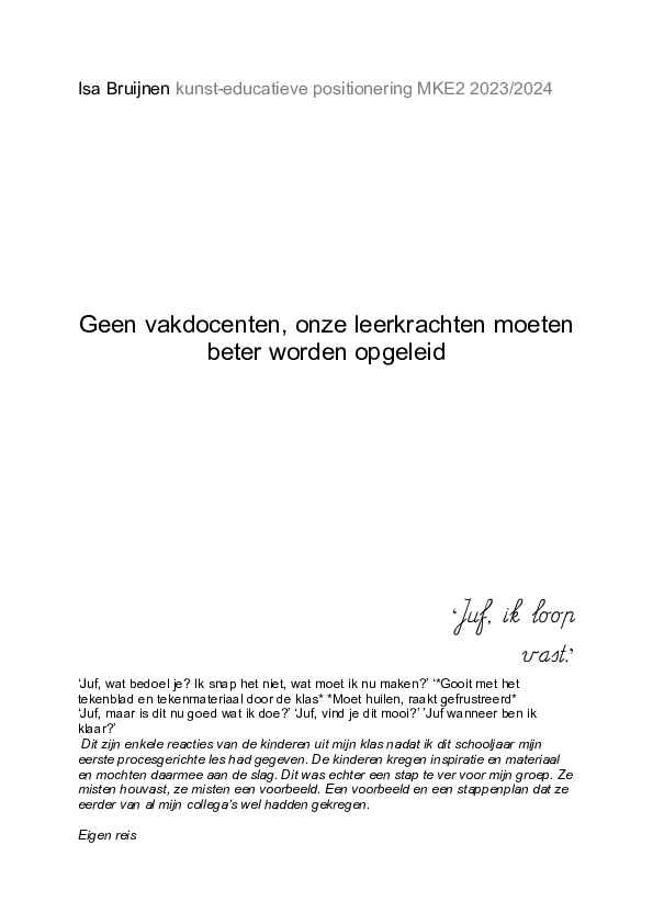 Tot mijn verbazing waren de lessen van Rita echt ondermaats. Alles wat ik gelezen en geleerd heb over hoe een kunstles moet zijn, was dit niet. Er werden alleen maar gesloten vragen gesteld aan de kinderen, de kinderen mochten niet reageren en de fantasie van het kind bleef achterwege, omdat het toch echt een 'vliegmobiel' moest zijn. Op het laatste van de powerpoint liet juf Rita de laatste dia staan. De laatste dia met voorbeelden van kinderen die al eerder een vliegmobiel van klei hadden gemaakt.