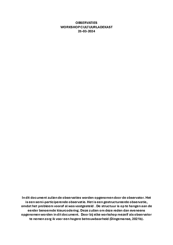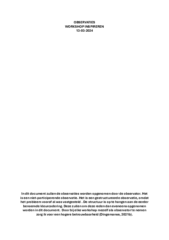 De workshop vindt plaats op een maandag na school, de leerkrachten zijn vrij om zich hiervoor aan te melden. De workshop duurt +/- 1,5 uur. Tiffany zal de workshop verzorgen, ik zit erbij om te observeren, noteren en waar nodig vragen te beantwoorden en te ondersteunen.