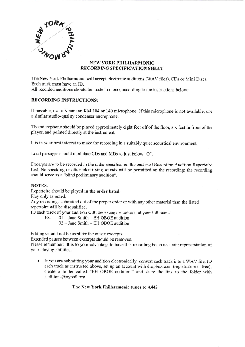 Many orchestras now ask for an audio recording as a pre-round to an actual live audition for candidates who have either just graduated or do not have much orchestral experience. Some orchestras also often use an audio recording as a blind preliminary round. Sometimes orchestras choose electronic auditions in a preliminary round to also help offset the travel and hotel costs.[5] Make sure your audio recording is of high quality, and be very critical of mistakes. Although a mistake is in itself not a disaster, the fact that you left it in the recording and did not take the trouble to do it again, would be considered lazy and not completely serious. If there is even a hint of bad intonation, do the recording again. Leave enough time to make the recording properly and do not leave it to the last minute. Choose a proper place to make the recording, preferably a hall which is not too dry and not too close to external noise such as traffic. Be extremely critical of your performance before submitting. If a video recording is requested, be also very critical of the visual aspect as well. Small details as poor lighting could affect the effectiveness of your recording. Miscellaneous items in the background could distract the viewer and the listener. Make sure you are also dressed in a manner appropriate for a stage performance.