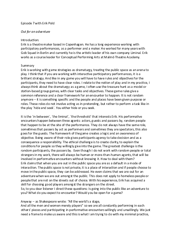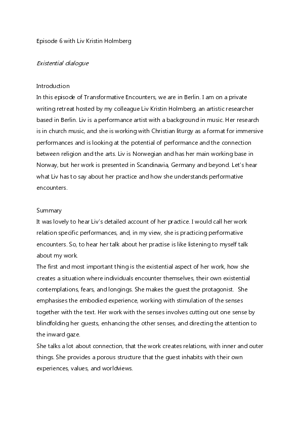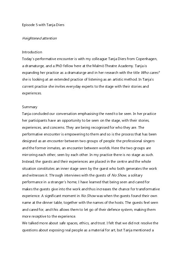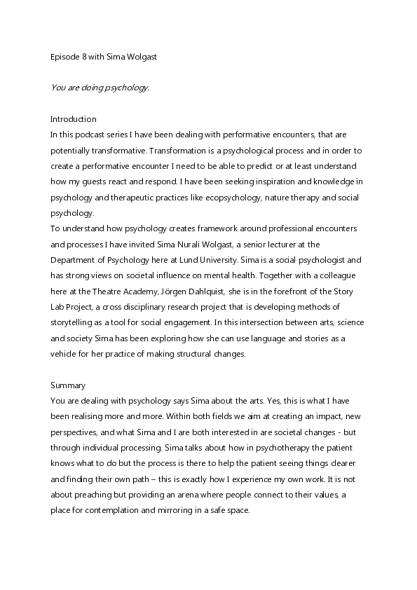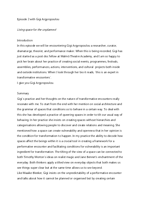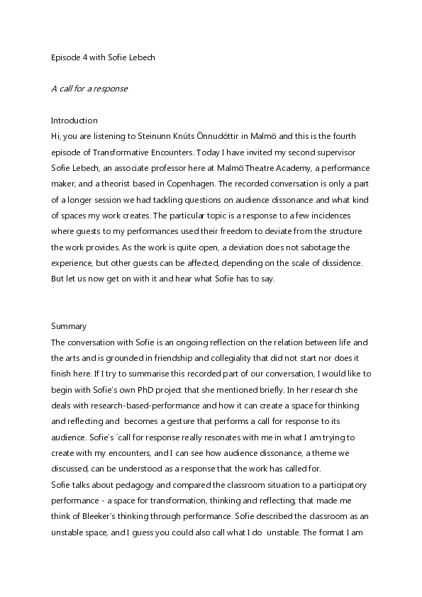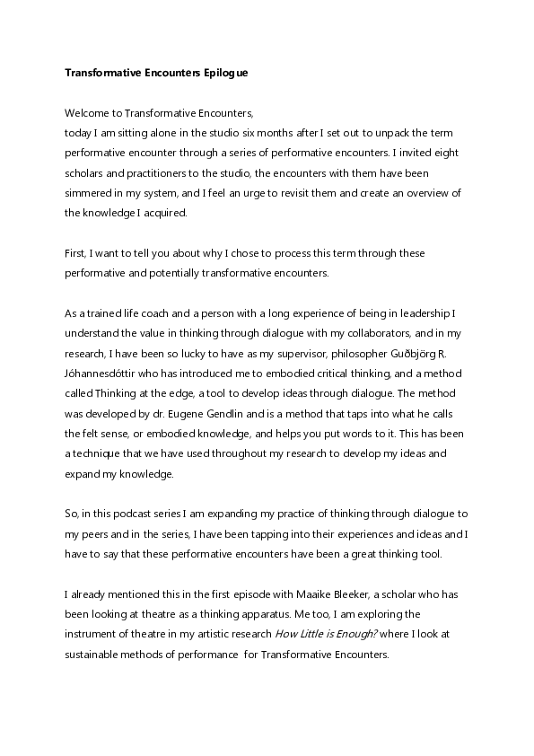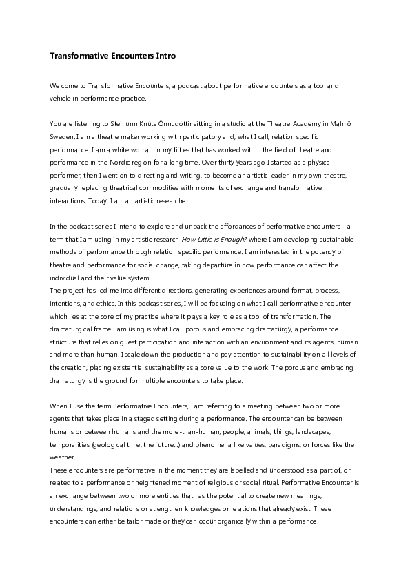 Transformative Encounters is a podcast series dedicated to the exploration and unpacking of the concept performative encounters within the realm of contemporary performance and how it can be understood. This series forms an integral part of the knowledge dissemination deriving from the artistic research project How Little is Enough? that is centered on sustainability and social change, conducted at the Malmö Theatre Academy by Steinunn Knúts Önnudóttir under the umbrella of Agenda 2030 a transdisciplinary Graduate School within Lund University. In the podcast, Steinunn extends invitations to european artists and theorists, where they engage in in-depth discussions and multifaceted explorations of this concept from diverse perspectives.