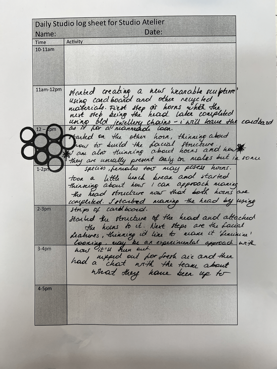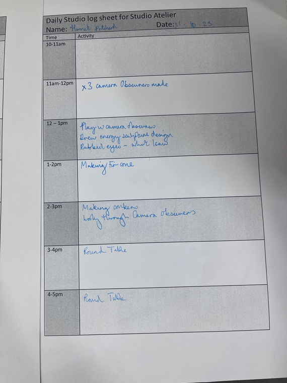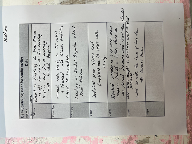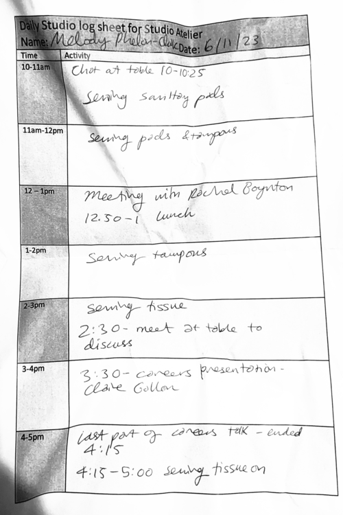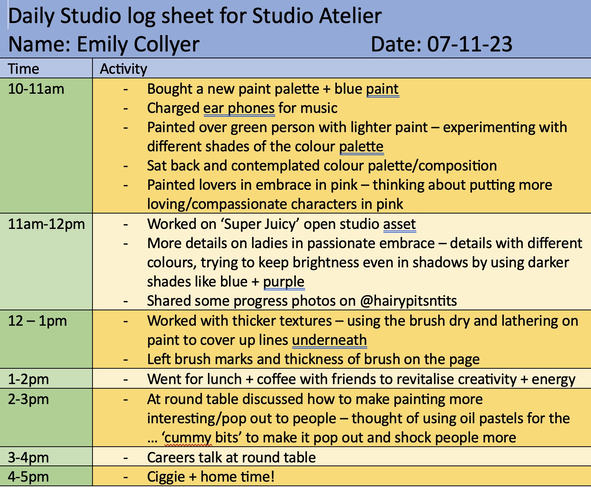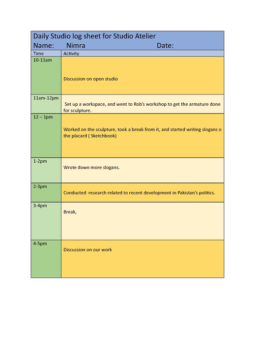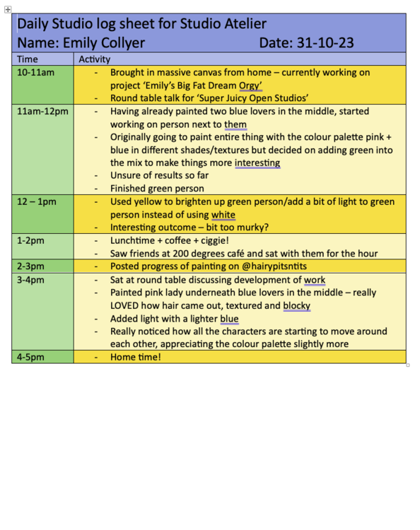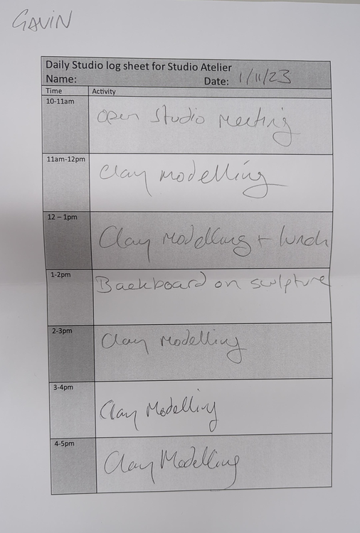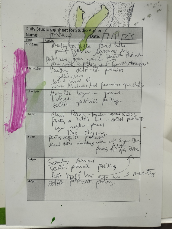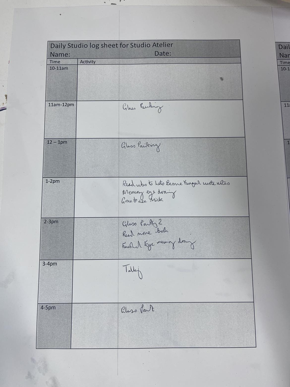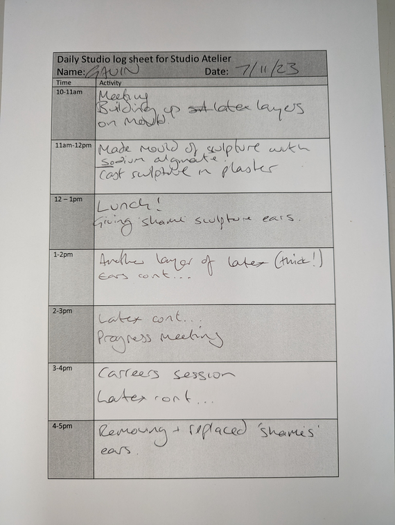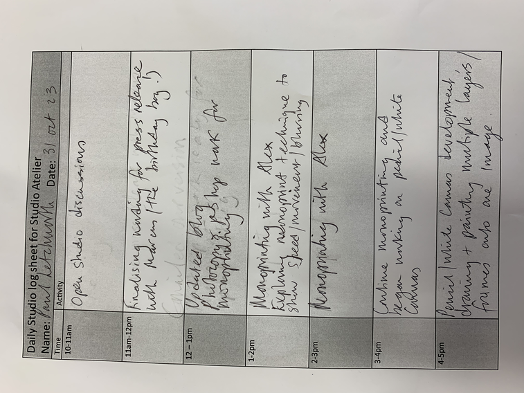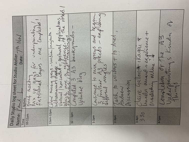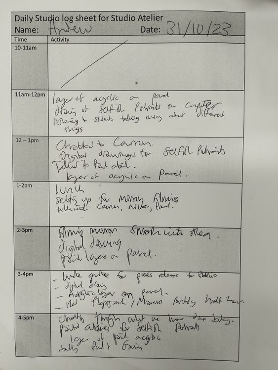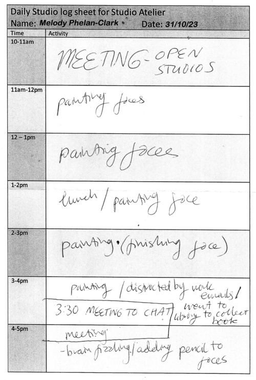 The studio Atelier is an updated and short term atelier residency that replaced formal scheduled teaching with the aim of teaching by demonstration. Rather than formal demonstrations, students observed informally and asked questions that were of relevance to their own practices, or just of personal curiosity. There was no obligation for them to engage with us, but our presence and work was unavoidable, as we were based near the entrance to the studios. Rather than creating a purely hierarchical relationship, feedback from students reported that they felt we were more approachable, had more time to discuss artmaking, and that they viewed us more as fellow artists than teachers during this period. The mood was friendly and convivial.
