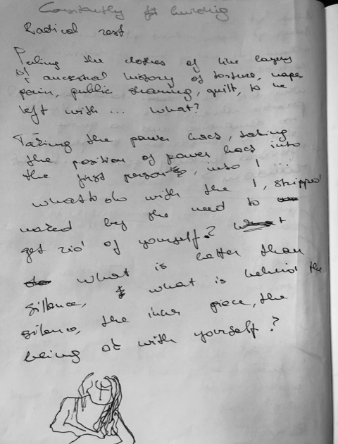 Let's see, yeah, okay, so one thing I don't know, like, I think one thing is related to this feeling and maybe I could have asked again or clarified I think I still have this feeling of I don't know what we're doing in this week, and I think more clarity around the purpose or for example what we're planning to disband now, like, what is your research question and we are part of your research process actually, and you're talking about consent and research, and I think part of me feels like “Oh, I actually want to know more what it is you're interested in when working with us in this way”. And maybe a clearer sense of how we will be working during the week, like, I guess something about feeling a bit confused of what's happening and then I'm sort of like “Okay I'll wait and see”, but then by the time you wait and see you don't have this moment of being able to relate to it or decide about it because it's already then too late or something.