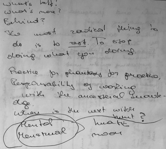 And yeah this is how I want to be in my life, yeah, grounded, fluid, flexible, intentional and I felt like this was really cool to see it in front of me in the way you were interacting with us, and I think it was both like in the individual interactions one-on-one, and then also with yourself and also with the group decision-making, guiding leading space open, but also making decisions yourself and guiding the flow of things sensing also the energy in the room, sensing when it's, you know, people are right for a break, or like that people are not really into this open sharing. Maybe there's different moments where this sensitivity was really, I thought, very fruitful or lovely as a way, as a guiding thing, yes. So that for me was a major, like, inspiration and valuable thing for me in this week, yeah and I think maybe what else could I say as a feedback… Well maybe I go through the… I have a small list of things I would do differently and this is yeah my personal spontaneous momentary feeling about it as suggestions or impressions from my personal point of view.
