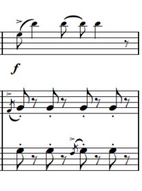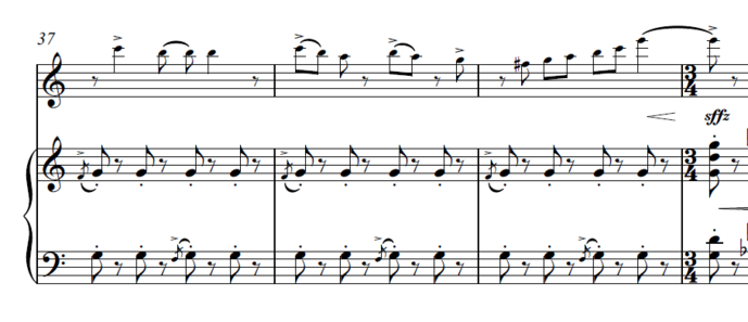 This rhythm was a persistent theme throughout the piece and was continuously developed. It was passed between piano and saxophone. The piece opens with this theme played solo by the saxophone. The piano enters after this first line is stated. Here are some other examples of where this theme was present in the piece: