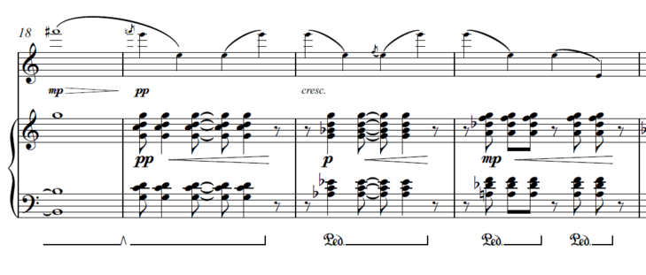 "It is comprised of two main ideas. The first being a rhythmic pattern based on morse code, and the second being a four-chord progression that repeats in different directions. The rhythmic pattern is formed from the morse code for J-O-S-I-E (heard clearly in the opening bars) while the chord progression is an expansion of a chord found in Schnittke’s Choir Concerto – a Gsus4 chord that moves stepwise eventually landing on a Bb^7 chord.