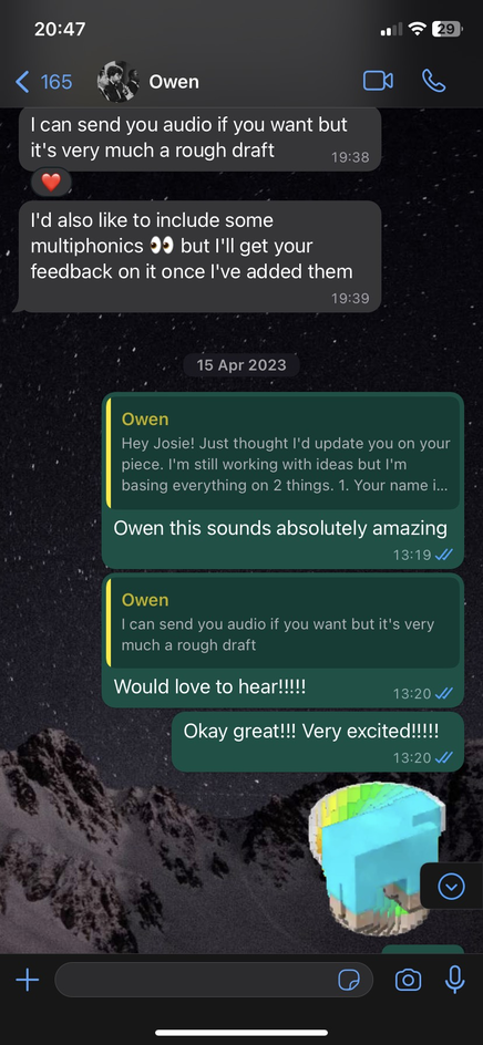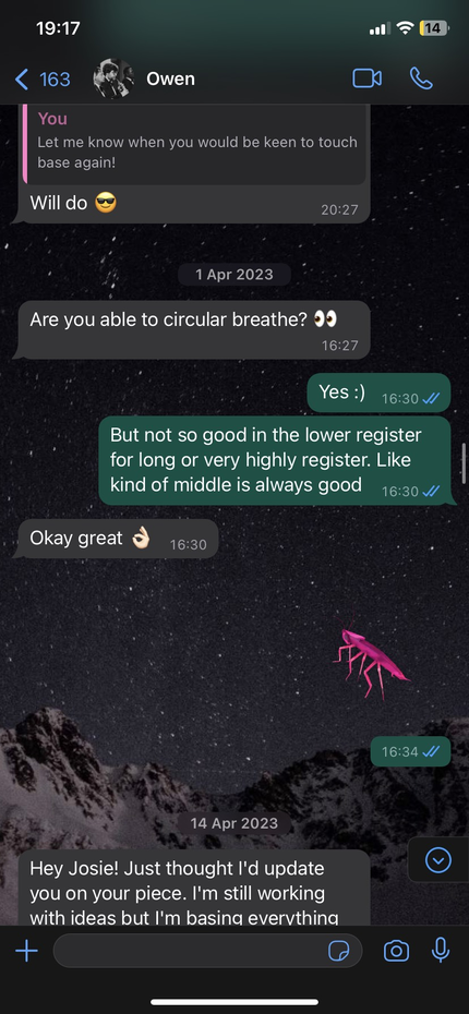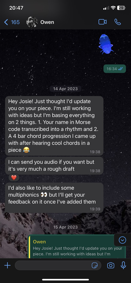 Owen was a great candidate to explore collaborative practice between close friends. I contacted Owen after realising that I potentially wanted to explore the prospect of curating a concert featuring South African works when I travelled back to South Africa in June 2023.