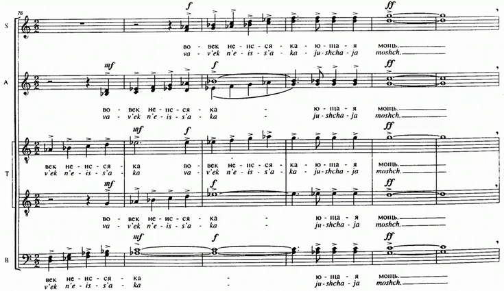 There is a sustained G in every chord that ultimately alters the colour of each chord, but this is how I would label the progression. Harmonically, most material is based on these 4 chords. For the most part, this progression ascends, but there are moments where is descends too. The chord I took from Schnittke's Choir Concerto happens in the first movement at measures 80-81. It’s a very climatic section at the end of a large build-up. The chord in question is a G sus 4 chord. I developed the remaining three chords in the progression following a chromatically ascending bassline and tight voice leading. All of this was done in my sketching phase while playing at the piano. (WhatsApp correspondence, 21 November 2023)