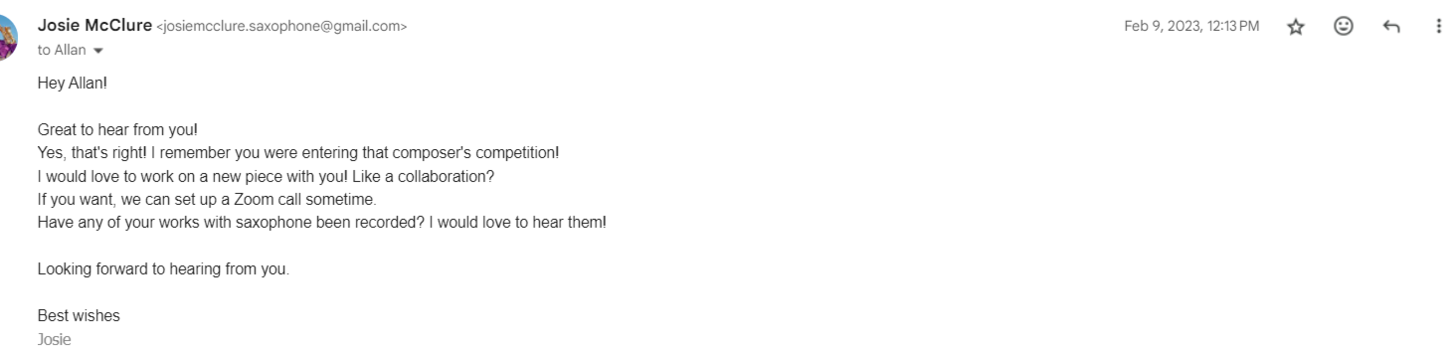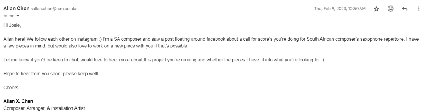 In total, Allan and I had 6 online meetings, and one workshop with ongoing correspondence via WhatsApp and email. I would describe this collaboration as being extensive and intense. Allan had minimal experience writing for saxophone, which made the exchange richer as there was a lot of room for experimentation. I felt very connected to this work, especially in the final performance. I believe the extensive level of collaboration was an influence in this connection. Allan is a person with a dynamic personality that pays immaculate attention to detail. It was a pleasure working with him and I hope to collaborate with him on future projects. This extensive level of collaboration led to a piece that felt like it was specially catered to my artistic needs and intuition.