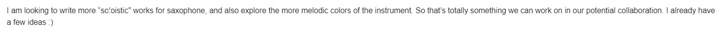 Meeting one took place on the 20th of February 2023 via Zoom. This meeting was more of an introductory exchange in order to become acquainted. I sent him a list of pieces for saxophone that I found to be inspiring. Most of this repertoire contained extended techniques and was composed in the latter half of the 20th century to current times.