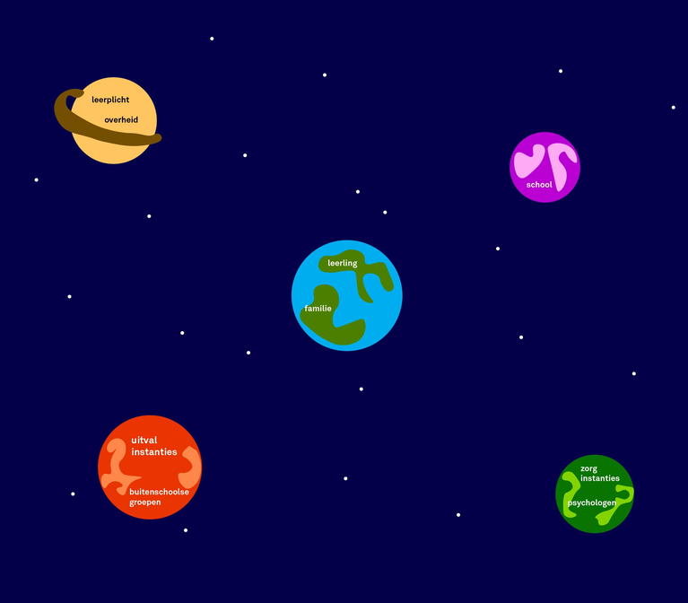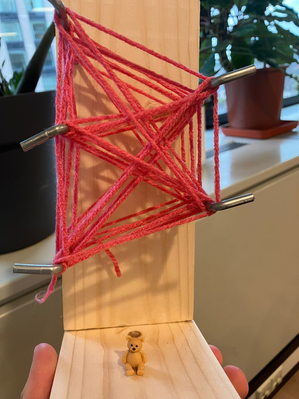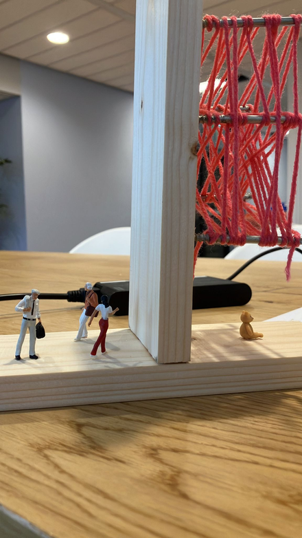 Wat: Dit object maakte ik om mijn blik op de probleemruimte te vangen en te kunnen delen. Hierin is het beertje de thuiszitter die door 'het systeem' is gevallen (roze touw). Degene die dit systeem in stand houden staan aan de andere kant van de plank, zien de thuiszitter niet en in geen staat om hen te helpen.