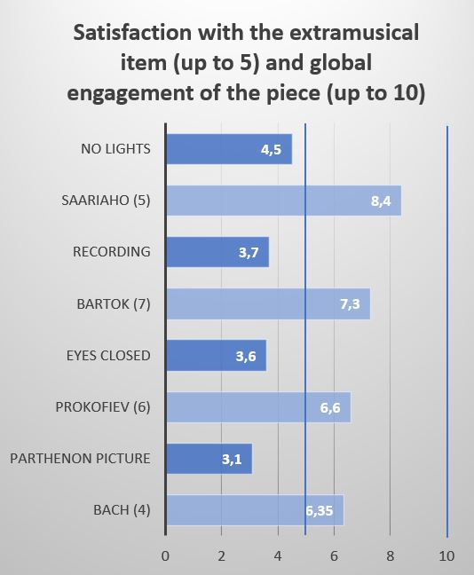 To 'spice up' the session even more, from the fourth piece onwards I added extramusical elements, meaning extramusical anything that was beyond the music or the piece, including actions and audible or musical resources that were not the pieces themselves, intending to manipulate or affect the emotional state of the public. For the first calm part in D Major of Bach's Chaconne (4), I showed the picture of the Parthenon during a sunset, for Saariaho's Nocturne (5) I switched off the lights, for the beginning of Prokofiev's Concerto (6) I asked to listen with closed eyes, and for Bartok's First Rhapsody (7) I gave details about the context of the piece and played back real Bartok's recordings of the traditional Hungarian and Romanian melodies. I asked to qualify the help of this extramusical element to be more engaged with the music from 1 to 5 (1 the least helpful and 5 the most) and I received interesting feedback.