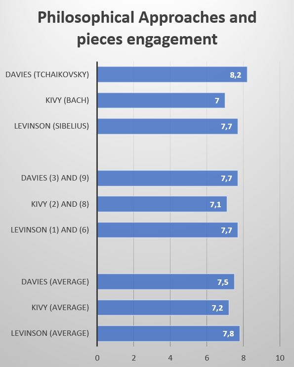 ENGAGEMENT OF THE THEORIES. The results of the questions attaching the philosophical approaches with a music-knowledgeable audience show a different picture because Kivy's beauty of music becomes the least engaging perspective: 7.2 of engagement doing the average of all the times it was used during the session, 7 in the first piece using exclusively this theory (the same beginning of Bach's Chaconne (2) like in the non-musicians sessions) and 7.1 if we take into account the two pieces in which Kivy's was the only approach allowed (Bach's (2) and (8), this last one being another fragment of the Chaconne in D Major). Davies' contagion keeps his middle position, but this time closer to the leadership: the global average is 7.5, the average of its two 'exclusive' pieces (Tchaikovsky's concerto beginning (3), like with non-musicians, and Bartok's Rhapsody (9)) is 7.7, whereas the first reception of only the Tchaikovsky (3) was clearly better: 8.2. However, the gold medal goes to Levinson's imagination thanks to its 7.8 global average. The sum of the first Sibelius' concerto beginning (1) performance and a second version of Bach's Chaconne beginning (6), both heard only with Levinson's mindset, has an average of 7.7, while only in Sibelius' beginning (1) the average is a little lower, 7.6.