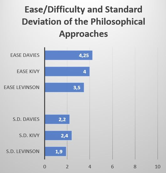 EASE or DIFFICULTY. Regarding the ease or difficulty of being engaged by making use of each approach, what we can see is that Levinson's imagination is again the simplest mindset, with a general average of 3.5 (out of 10, being 1 really easy and 10 extremely difficult)1 and a little higher 3.8 in its first contact with Sibelius' performance (1). Davies' contagion and Kivy's beauty of music are once more quite close to each other, but changing their positions, being now Davies' qualified as the most demanding one with a global 4.25 versus a 4 of Kivy's (same results looking at the first contact with each theory in Tchaikovsky (3) and Bach (2)). See Figure 21.