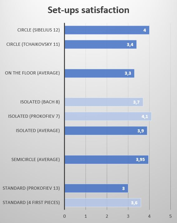 Concerning the different settings tested during the sessions with musicians, the results show that preparing something unconventional could be worth it. Five different set-ups for the audience and the performer were chosen: a standard one, with the public sitting in front of the player at a standard distance, quite symmetric and grouped; a semicircle, with the musician in the middle of the hypothetical full circle; another one with the listeners as distanced and isolated around the hall as possible; another one with the audience sitting on the floor, and the last one with them placed now in a full circle. Each participant could respond if each set-up helped them or not to be engaged by listening to each musical piece from 1 (not helpful) to 5 (definitely profitable).