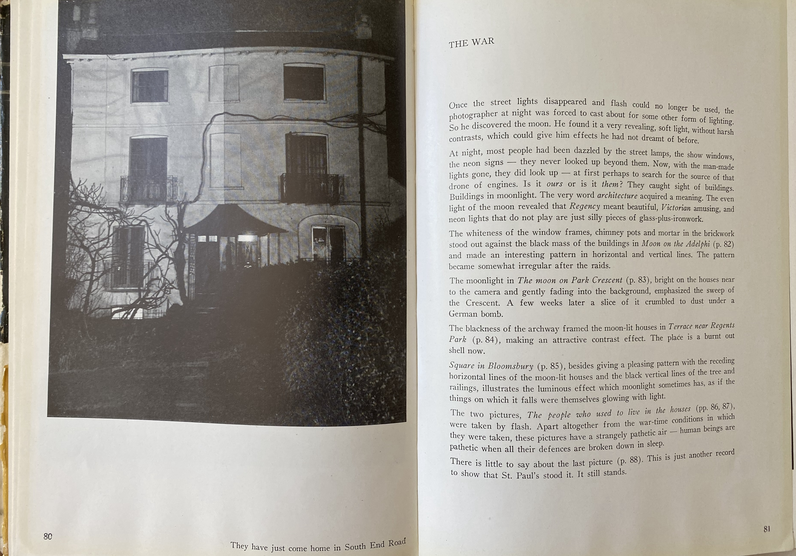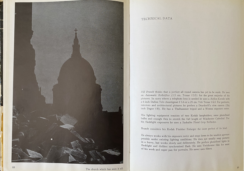The first still photographers though to have produced large bodies of work at night, were Brassaï and Brandt, who delivered images of cities, therefore of anthropized areas. This is what Brassaï did with Paris' artificially illuminated streets (Paris de Nuit, 1936, is one example) or Bill Brandt did with London's only moonlight illuminated streets during a black out during World War II: St. Paul's cathedral, 1942. Bill Brandt wrote about his encounter with the night and night photography in his early book Camera in London (Publisher: The Focal Press, London, 1948). Pages extracts, courtesy of John-Paul Kernot, Bill Brandt Archive 4 Airlie Gardens London.