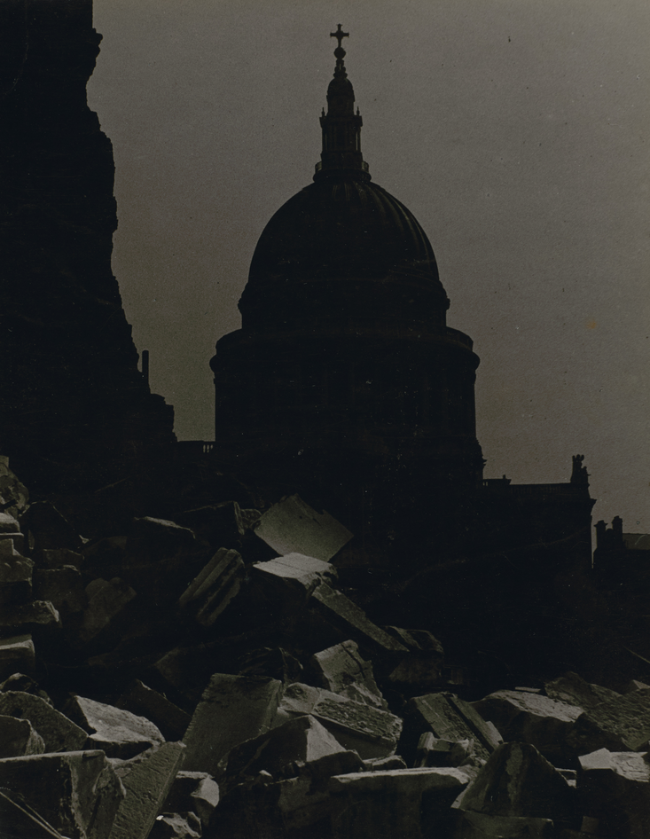 Description: St. Paul's Ruins in Moonlight (Blackout in London). Gelatin silver print with ferrotyping; 20.7 × 16.1 cm. Lent anonymously (L.1990.151.44).