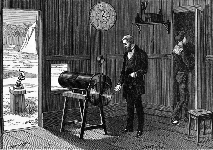 This is a story of another use of glass plates: 1882, astronomer David Peck Todd traveled to the Lick Observatory in California to photograph Venus transiting the face of the Sun from their solar photographic telescope. More than a century later, these frames were digitalized, animated, and compiled into a movie. As the transit unfolded, Todd obtained a superb series of plates under perfect skies. His 147 glass negatives were carefully stored in the mountain vault. But as astronomers turned to other techniques for determining the scale of the solar system, the plates lay untouched and were eventually forgotten. 2002, Anthony Misch and Bill Sheehan found all 147 negatives, still in good condition, at the observatory. To their knowledge, this collection of photos constitutes the most complete surviving record of a historical transit of Venus. As they looked at Todd's extensive sequence of images, they realized they could turn them into a film. A similar thought may have occurred to Todd himself, for a number of his contemporaries were already making the first forays into chronophotography — the forerunner of cinematography. Indeed, Pierre Jules Janssen invented his famous photographic revolver to capture the 1874 transit of Venus. It was actually this instrument that originated chronophotography, a branch of photography based on capturing movement from a sequence of images. To create the apparatus Pierre Janssen was inspired by the revolving cylinder of Samuel Colt's revolver.