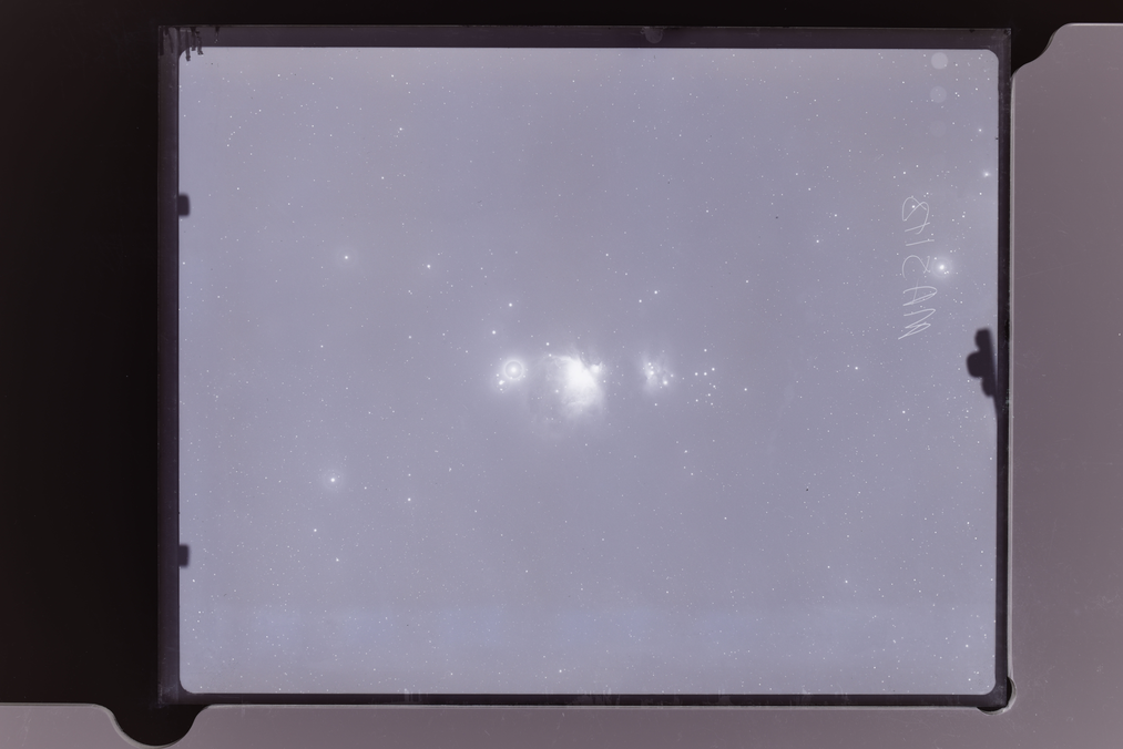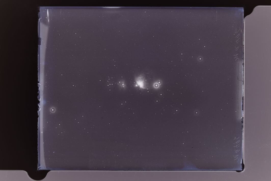 The ORION NEBULOSA from ma telescope (12 inch metcalf doublet in Cambridge, MASSACHUSSETS), taken on 27 JAN 1936 at 03:28 am (original GLASPLATE 05118)