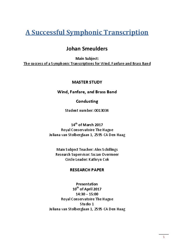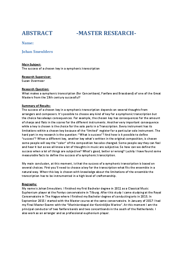 Name: Johan Smeulders Main Subject: Wind Orchestra Conducting (HaFaBra) Research Supervisor: Suzan Overmeer Title of Research: The success of a symphonic transcription Research Question: What makes a symphonic transcription (for Concert band, Fanfare and Brass band) of one of the Great Masters from the 19th century successful? Summary of Results: The success of a chosen key in a symphonic transcription depends on several thoughts from arrangers and composers. It is possible to choose any kind of key for a symphonic transcription but the choice always has consequences. For example, the chosen key has consequences for the amount of sharps and flats in the individual parts for the different instruments. Another very important consequence, while a different key is chosen, is the choice for the solo parts in a transcription. Every instrument has its limitations within a chosen key because of the “limited” register for a particular solo instrument. The hard part in my research is the question: “What is success”? And how is it possible to define “success”? When a different key, another key than what is written in the original composition is chosen, some people will say the “colour” of the composition has also changed. Some people say they can feel and hear it but as we all know a lot of thoughts in music are subjective. So how can we define its success when a lot of things are subjective? What is good, better or wrong? Luckily, I have found some measurable facts to define the success of a symphonic transcription. My main conclusion, at this moment, is that the success of a symphonic transcription is based on several choices. First you will need to choose a key for the transcription that fits the ensemble in a natural way. When this key is chosen with knowledge about the limitations of the ensemble the transcription has to be instrumented in a high level of craftsmanship. Biography: Johan Smeulders finished his first Bachelor degree in 2011 as a euphonium player at the Fontys Conservatoire in Tilburg. He finished his Bachelor degree of Conducting arts studying at the Royal Conservatoire in The Hague in 2015. He is the principal conductor of two fanfare bands and two concert bands in the south of the Netherlands. He also works as an arranger and as a professional euphonium player.