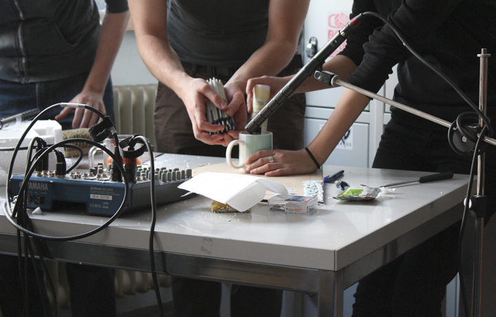 As mentioned above, our methods need to be accessible to someone with very little previous experience and open for heterogeneous groups with different backgrounds in terms of sound and music production. Foley, the technique of creating sound effects synchronous to film, is ideal for this and can be easily learned through a set of simple exercises (e.g. “Semantic Foley”, see [Hug 2010b]). Combined with the possibility of making sounds with the voice and the body, it offers a vast amount of sonic possibilities with a very simple technical setup (Ament 2009). One technical element, however, is essential: Just as in actual Foleying, the sounds made must be captured with a microphone. The microphone is the first element of an electroacoustic sonic transformation and provides an aesthetic link to the following step in the design process, the electroacoustic mockup. The microphone, and the projection of sound through a loudspeaker, provide an acousmatic listening condition, which further supports the understanding of sound transformation in the electroacoustic condition.