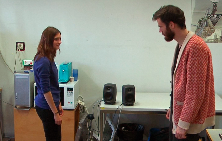 The intention of the group was to confuse both participants by using strange and alien tones, requiring them to cooperate in resolving the confusion and thus reducing the inhibition to interact with each other. The sounds were produced by voice. This had the advantage that the resulting sounds had a complex texture and were not too static, despite being pitched. The disadvantage was that there were interruptions of the sustained tone caused by breathing, which could be misunderstood as the beginning of a new sound event. Also, the voice was not strange or alien enough for the desired effect of confusion, as it was recognizable as being the voice of a human being. Moreover, this recognizability made the sound rather funny.