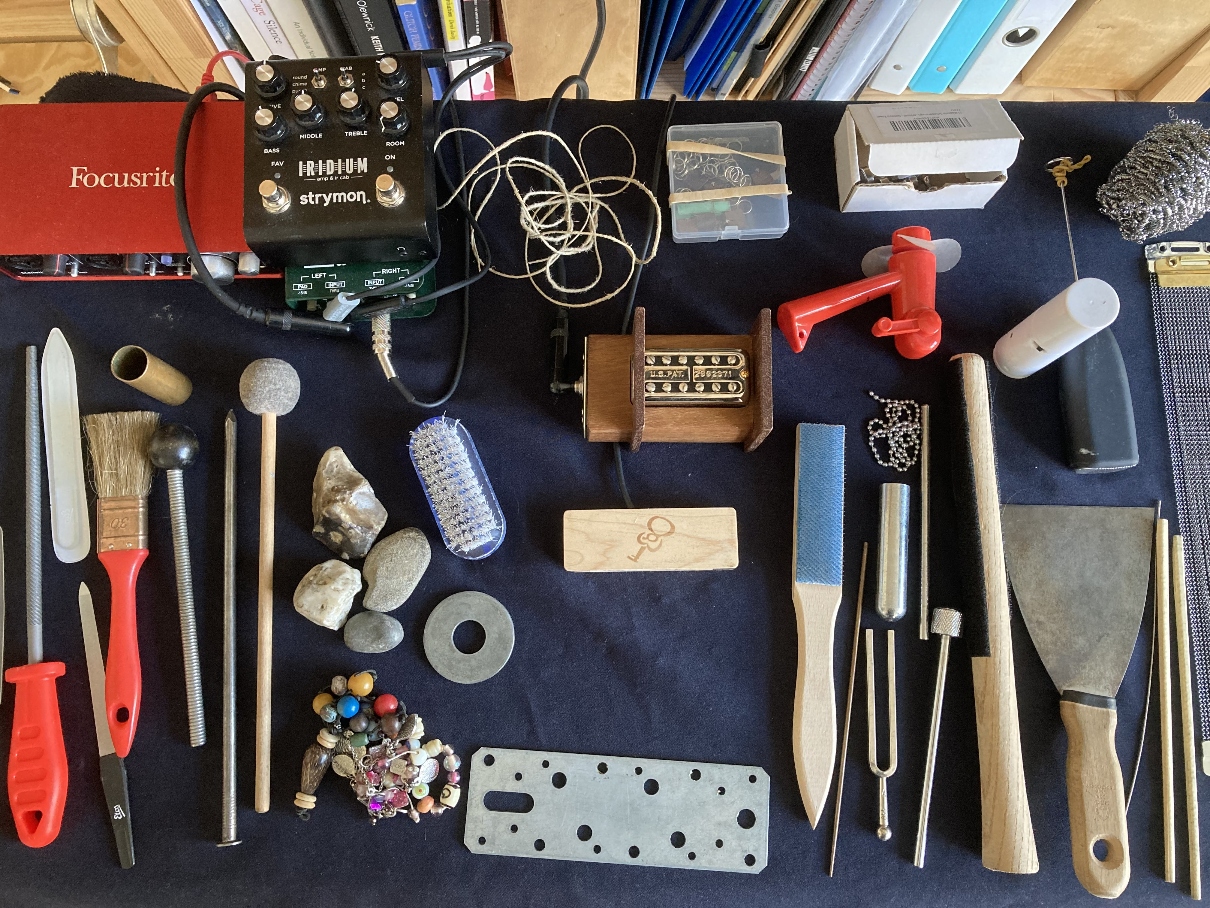 Not all potential guitar objects can be captured with this method, however. Often, interesting behavior that I could never have imagined emerges from the objects within the object guitar system. Only collecting objects that prove interesting in the field would limit these rich emergent behaviors. This is why I collect objects liberally, like the field recordists with their vast sound archives. Some objects might spark my interest through their visual appeal, while others might have an exciting construction whose interaction with the guitar I cannot yet imagine clearly. I document the reasons for choosing the objects so that I can refer back to them.