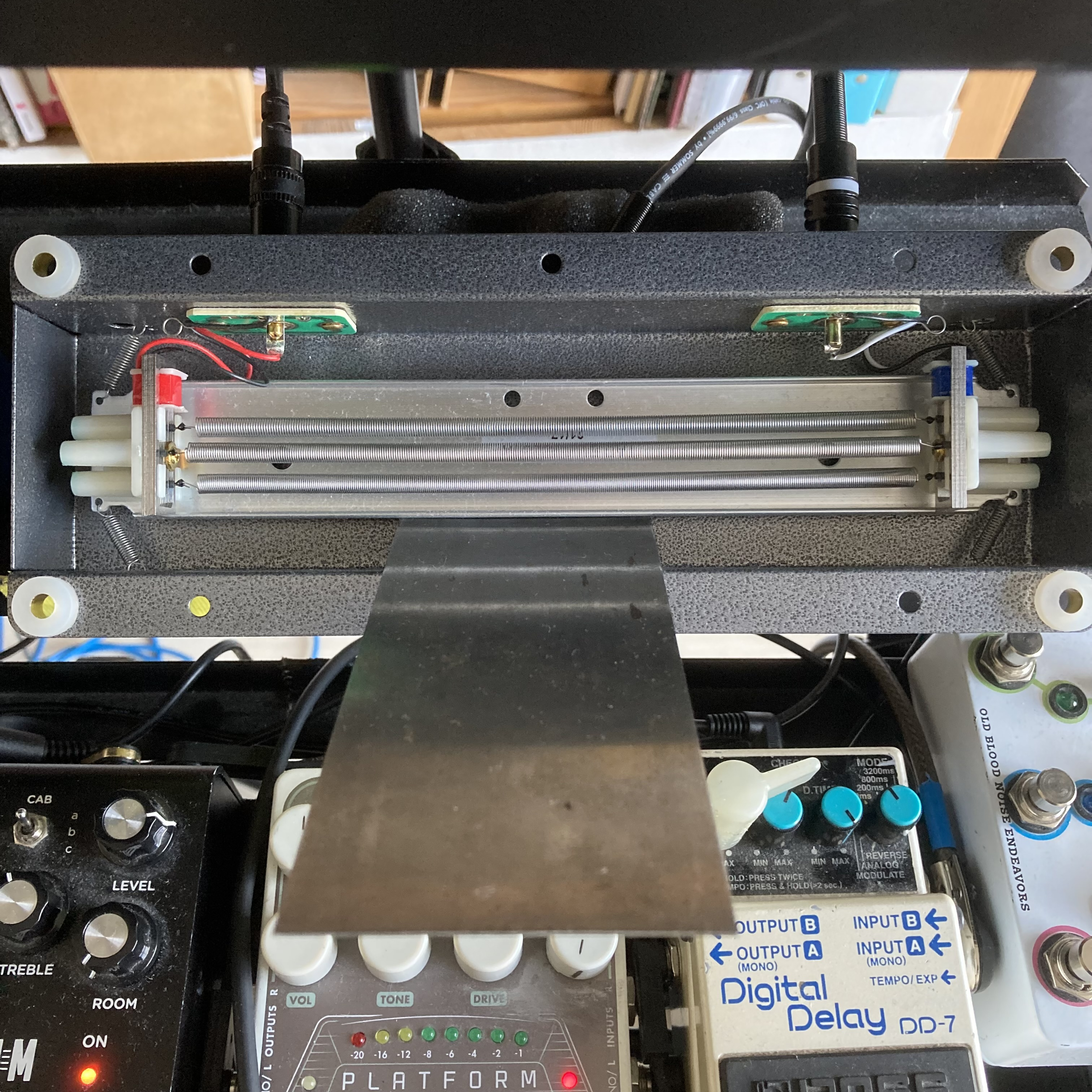 While embodying a progression of the deconstruction guitars, the Phantom Limb Guitar does not replace them but rather exists simultaneously with them. I will continue to work on the deconstruction guitars and nurture their further development. I want to create a Prepared Table with a patchwork of surface textures and explore the possibilities of holding the transducers of the Object Zither, the No-string Object Guitar, and the Prepared Table in my hand rather than in a fixed position. Before I worked on the spring reverb, I started to develop a string reverb. This instrument is based on the Ondes Martenot Palme speaker, a wooden cabinet with strings that resonate with the signal from a loudspeaker that is sent through them. I needed to pause the development of the string reverb because it would take a long time to build and be very costly.