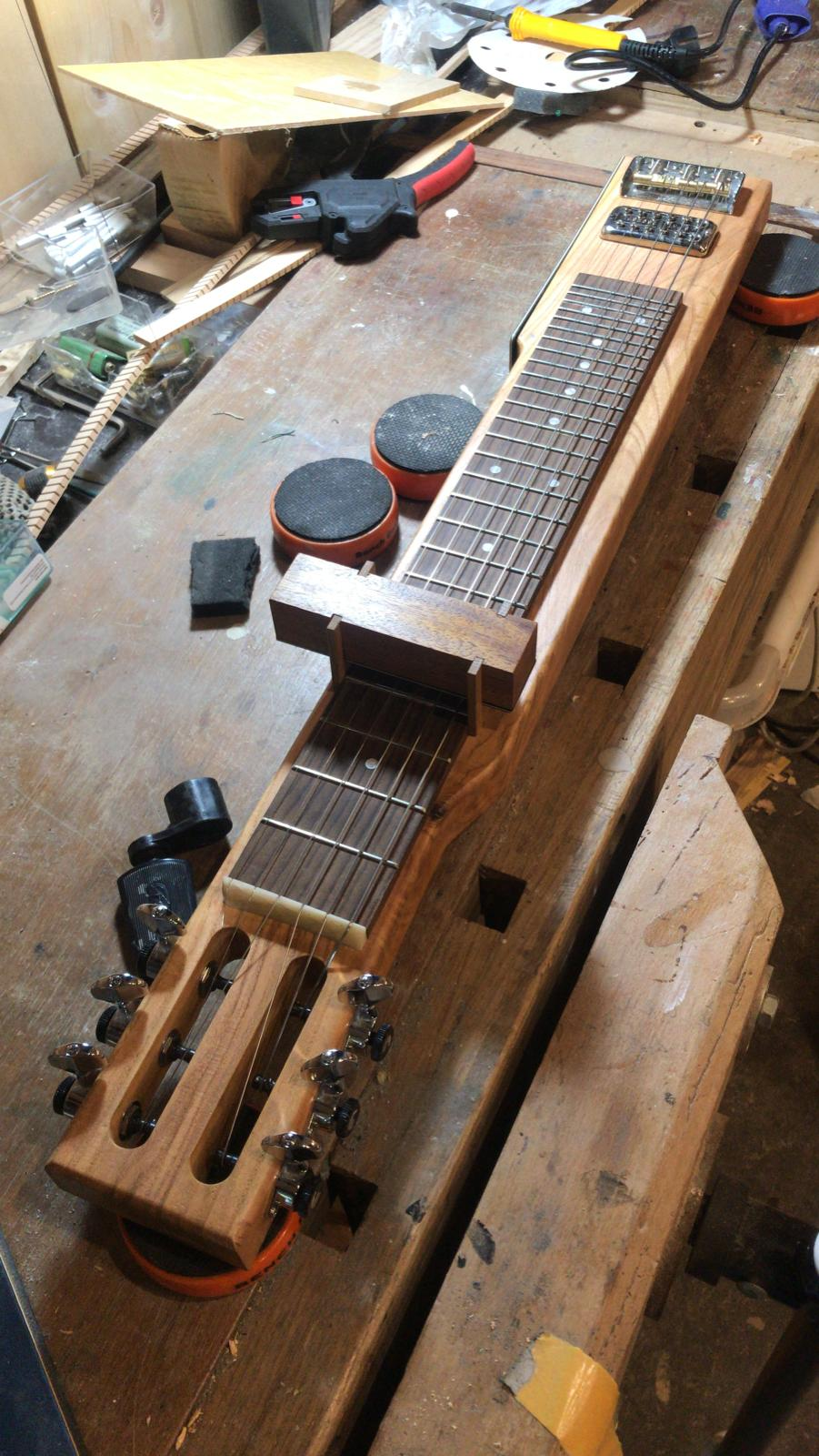 The main difference between the Electric Hawaiian guitar and the tabletop electric guitar is that the tabletop guitar is not made to be played only with a steel bar. For the 6-string guitar under discussion, I would like to still be able to fret the strings, to have a very quick and immediate way to modulate the pitch. To enable this, Pelle and I modified the Hawaiian guitar by adding frets and making the action (the distance between the fretboard and the strings) much lower, since the Hawaiian guitar has a much higher action than a regular guitar and has frets only to mark where the different pitches are located along the strings.