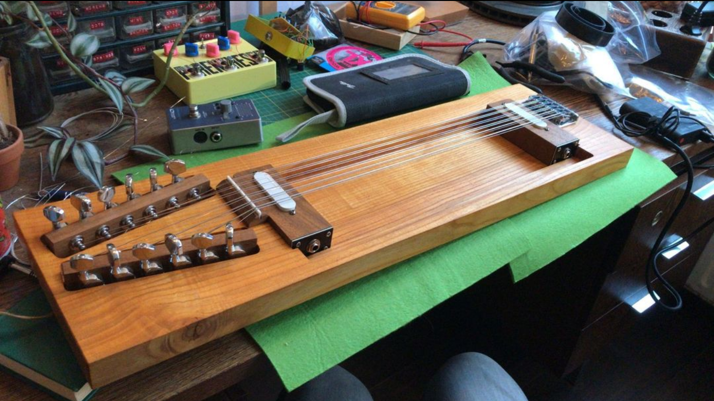 My interest in the modification of the electric guitar led me to the work of Yuri Landman. Apart from modifying guitars, Yuri Landman is well known for his work as an experimental instrument builder. As part of a workshop, we built his White Eagle guitar. This is a rudimentary guitar, made of hardware store components, but with a string section behind the bridge that is tuned three octaves above the string section in front of the bridge. The two string sections will resonate through each other, creating a haunting shimmering sound in the section behind the bridge. Underneath this higher-octave string section sits a magnetic pickup that can go to a separate output or be mixed in with the regular string section. The behind-the-bridge sound was unlike any guitar sound I had heard before and made me aware that there are possibilities beyond the traditional electric guitar design that are worth exploring. The White Eagle—like Yuri Landman’s many other instrument inventions—reinforced my view on the amorphousness of the electric guitar, opening up the path to a more fluid conception of the instrument.