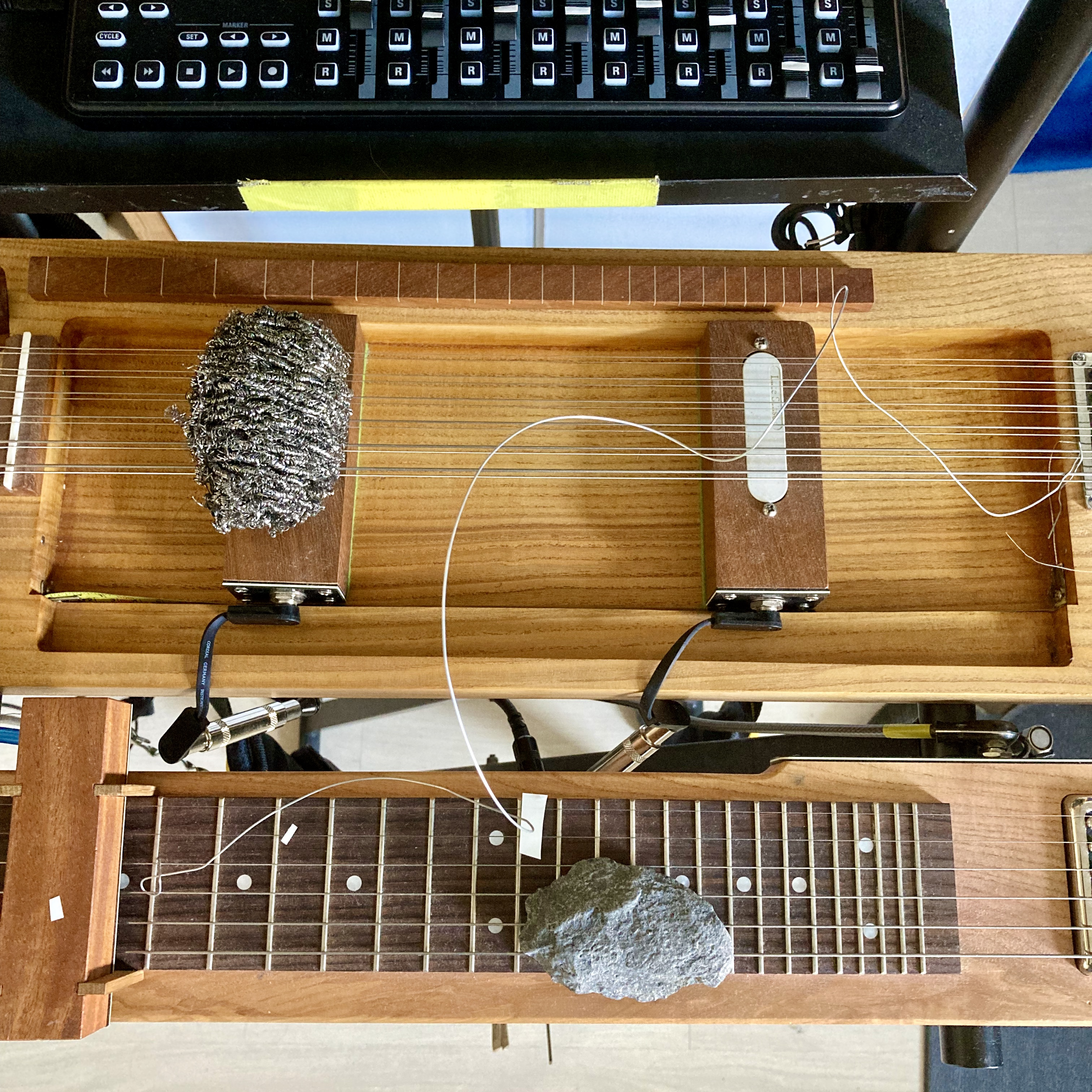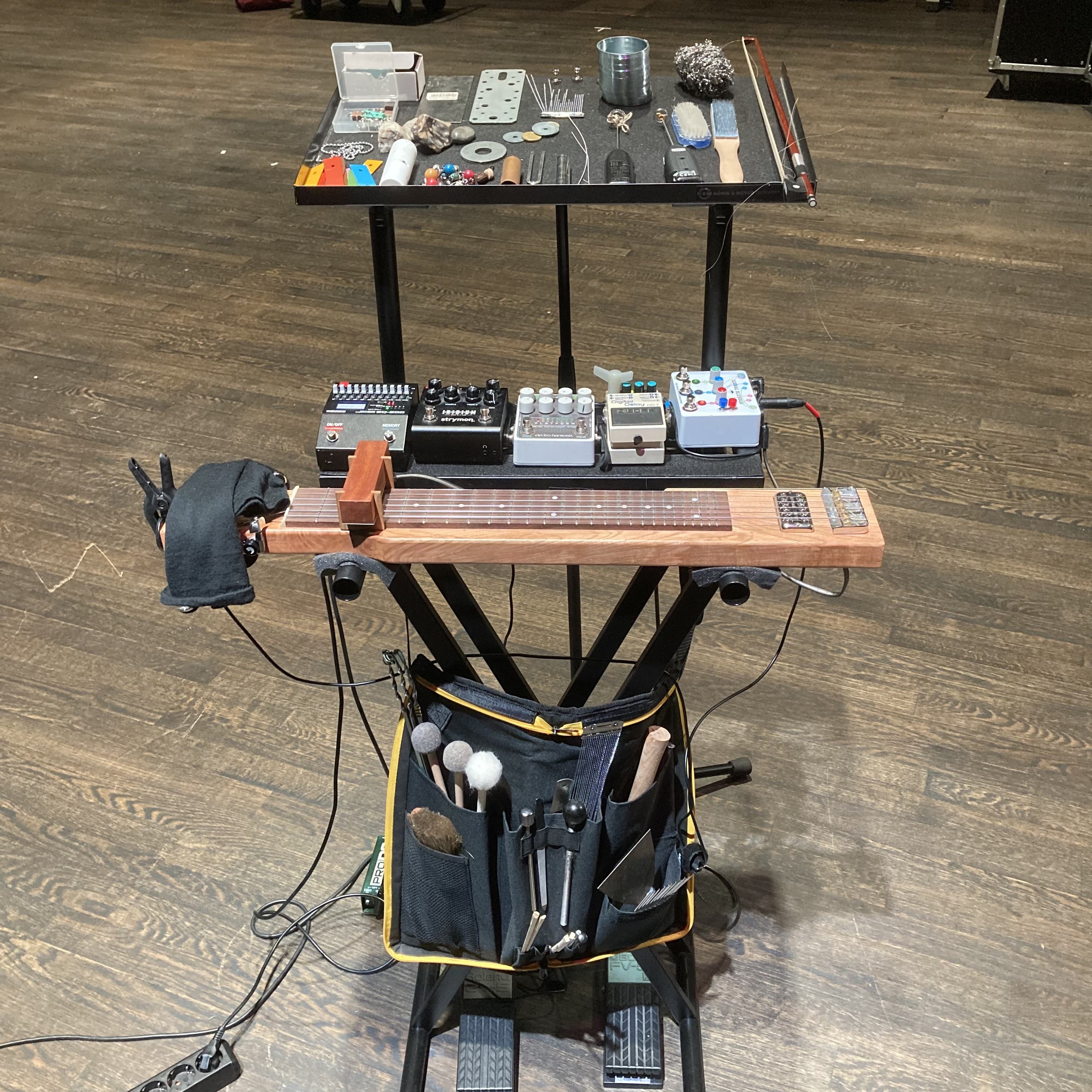 With this approach, I developed a series of experimental instruments and devices. Experimental instruments explore novel possibilities in instrument design but also provide a platform for experimentation. These instruments magnify the improvisational characteristics of the existing electric guitar. The 18-string Object Guitar is a gradual development of the electric guitar into a dedicated tabletop instrument. A series of Deconstruction Guitars break down the electric guitar into fundamental elements to understand their function in the prepared guitar system. All the instruments and devices form an open-ended series of constructions; each playing situation has a different configuration of these instrument and device modules.