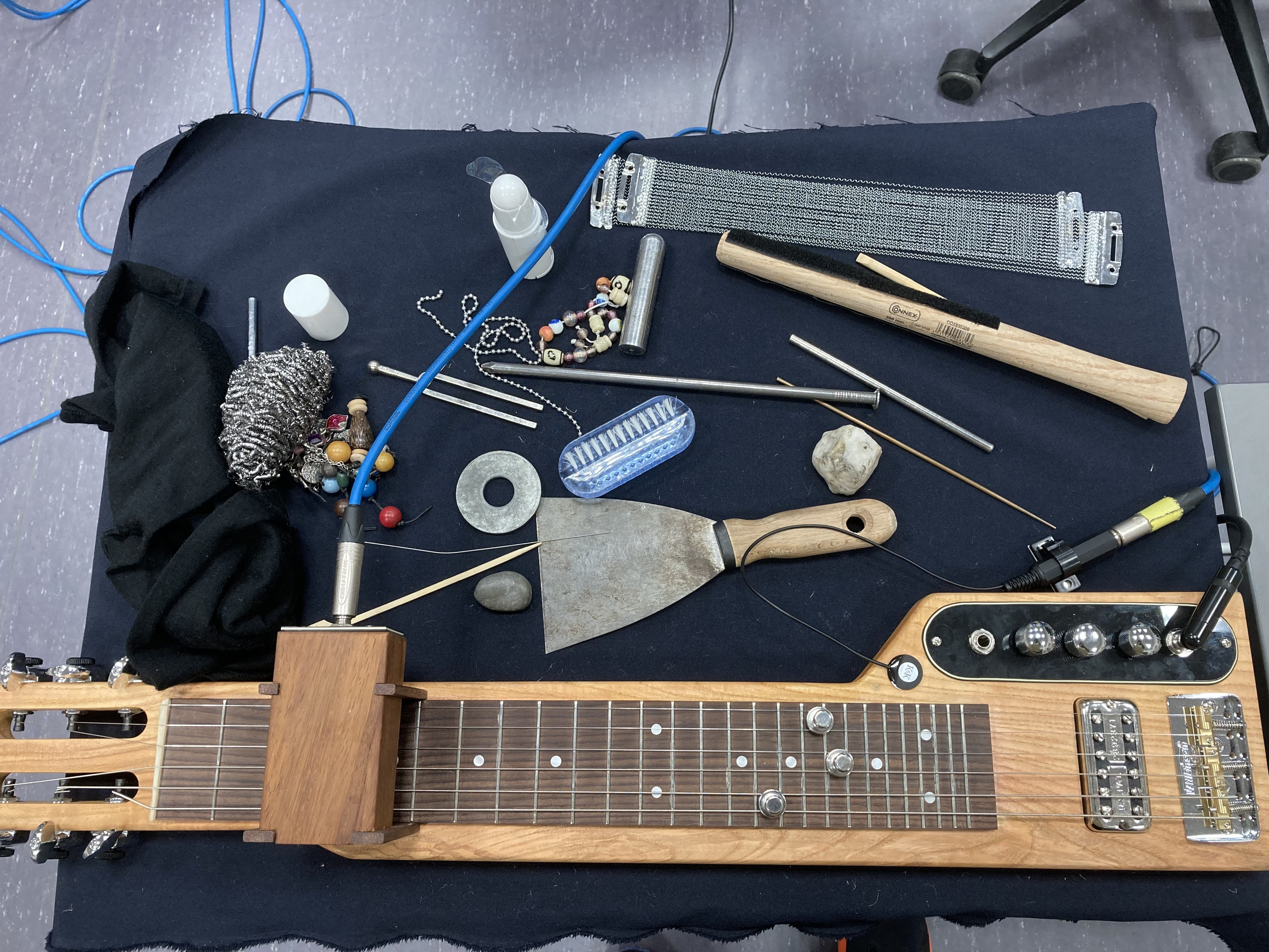 Once we introduce (found) objects into the electric guitar system, the sensitivity and timbral range of the guitar is even further extended. The strings and pickups are already sensitive to being actuated in different ways, but so are most of the objects used to actuate them. Every small change in one of the actors in the system can cause a major shift in the whole.