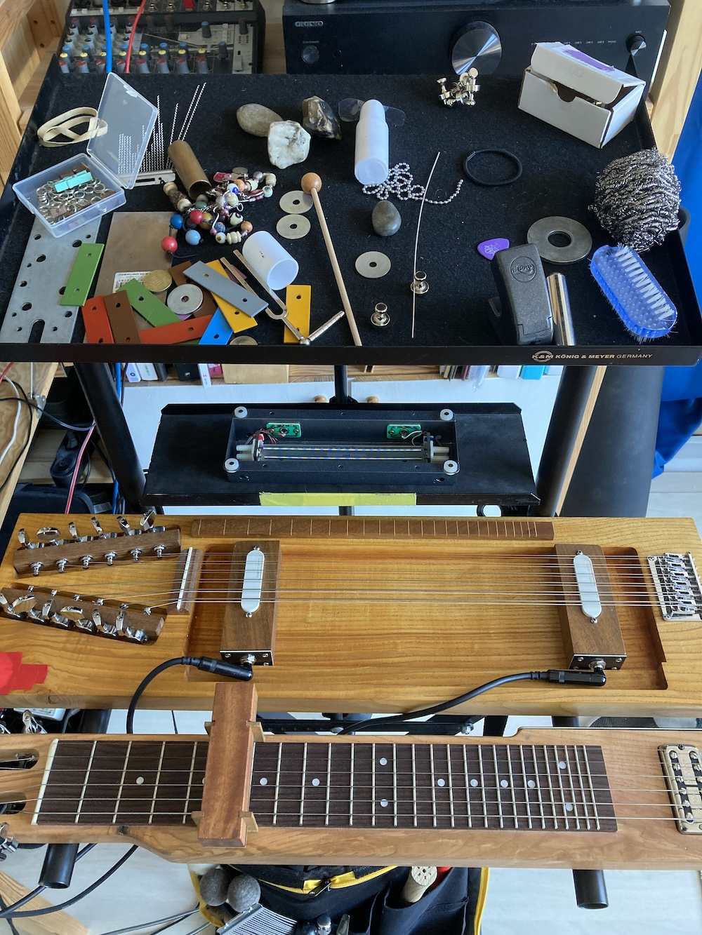 The first instrument that I started to develop I call the 18-string Object Guitar, in reference to Derek Bailey’s “19-string (approx) guitar”, a 6-string acoustic guitar with loose strings dangling from the guitar body. The 18-string Object Guitar is a culmination of all my previous experience playing prepared (tabletop) guitar, with the double-neck Epiphone SG as a starting point. Just like the double neck SG, the 18-string guitar has one part with six strings and one with twelve strings. In the 18-string guitar these two parts are separate instruments that can function fully independently, as described below. However, when the two guitars are used together and form the 18-string guitar, they give the full benefit of the double neck Epiphone SG. It’s possible to create complex assemblages and many simultaneous layers in a way that is impossible on a regular 6-string guitar.