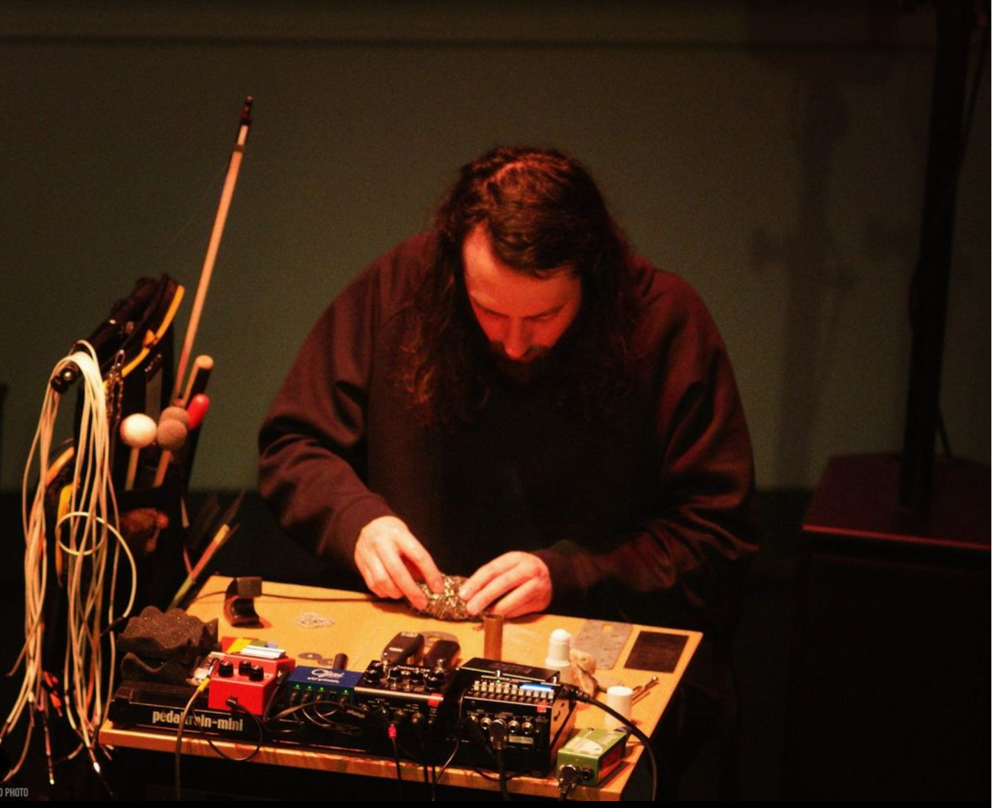 Those effect pedals aren’t very flexible anyway. They often do just one sound, or a little variation on it. But I’m interested in the relation between multiple sounds, placing them in order, or juxtaposing them to create a sonic progression. But for that, and for the people you’re playing with, you need to be flexible and fast. I figured the best way was to use all sorts of materials to agitate the strings, sticks, stones, screws, metals, motors and the like, because a slight change in the position of the screw can create something totally different. (Hopkin and Landman 2014, 6)