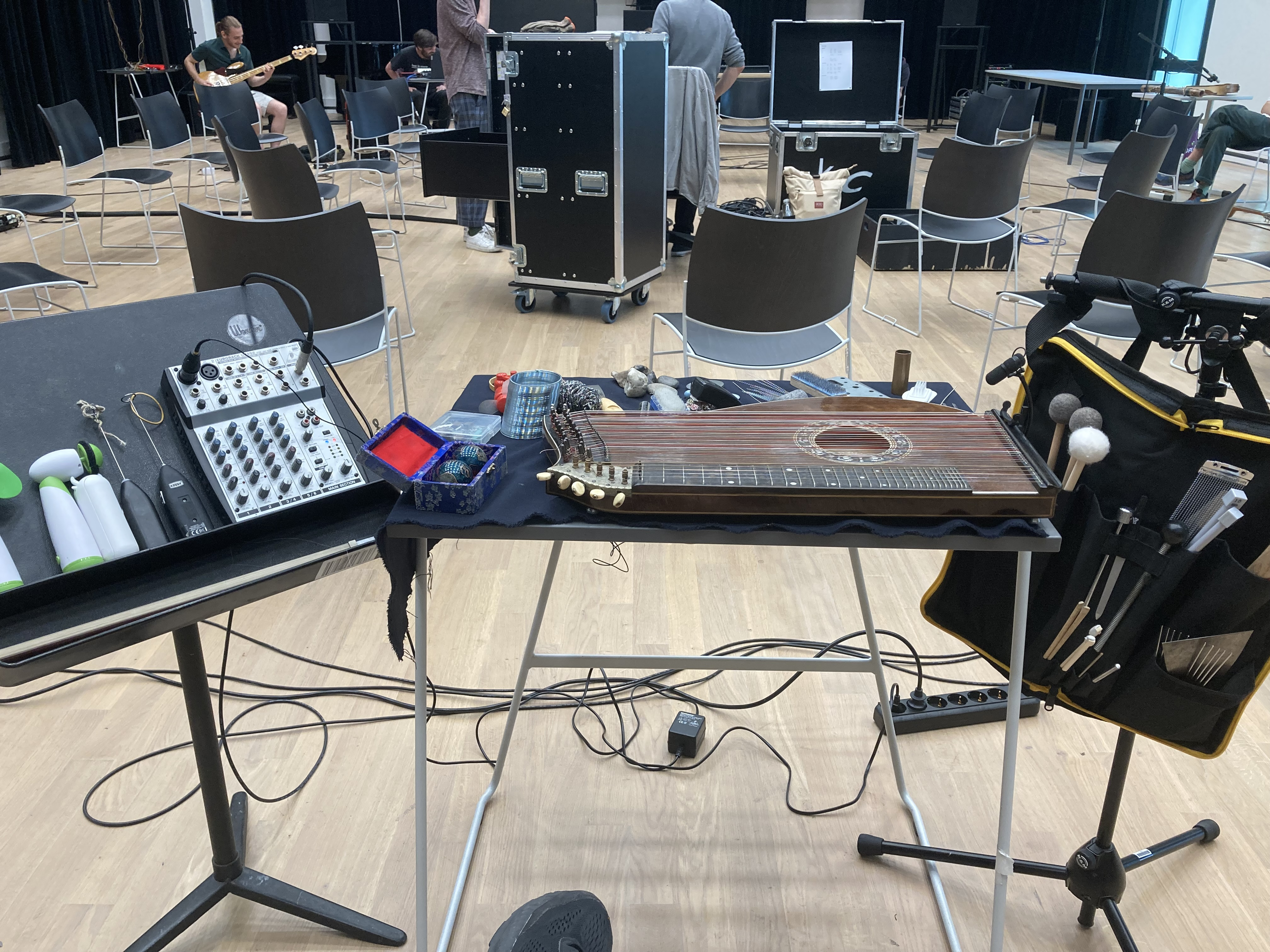 Another instrument that led me down this path was an double-neck Epiphone SG guitar, which Wiek Hijmans was so kind as to lend to me. This guitar has two necks, one with 6 strings and one with 12 strings, with both necks having their own pickups. This makes it essentially two guitars in one body. With a switch it is possible to select one or the other, or both guitars at the same time. Initially I was mostly intrigued by the potential of the 12-string. I already wanted to explore for some time the potential of having string courses, instead of single strings. This makes it possible to use objects in a similar way to the prepared piano, for example by wedging them between the strings. I decided that the most effective way to learn more about the instrument would be to directly engage with it in a musical context. The Sonology electro-acoustic ensemble (SEE) workshop of November 2021 provided a perfect opportunity for this.