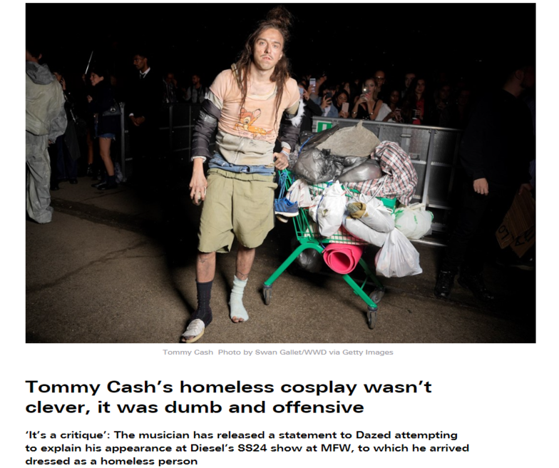 The trend is compared to cultural appropriation. These designers are using these people living without basic necessities as inspiration and for stylishness. These priviledged people are not willing to or able to look at the homeless and their situation and think about the social ecenomical problem they seeing. They view it through their own lense and ignore the rest.