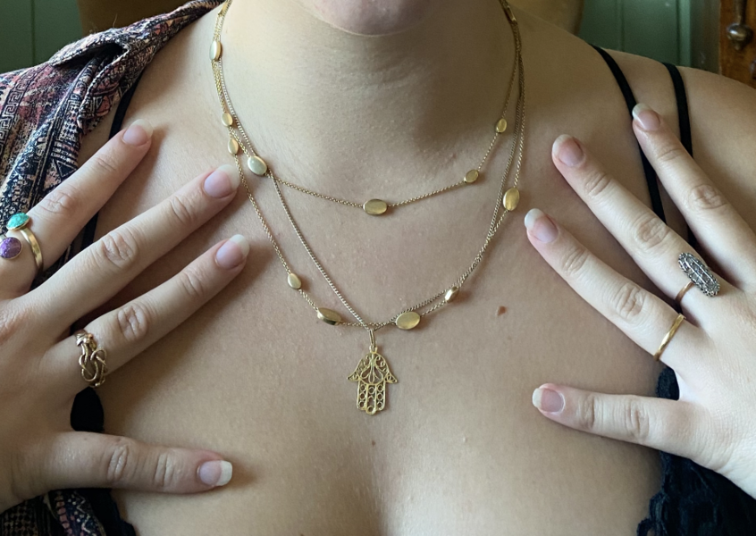 I brought a golden necklace with the hand of fatima also known as a hamza hand. It comes from the islam and Judiïsm. It’s for good luck