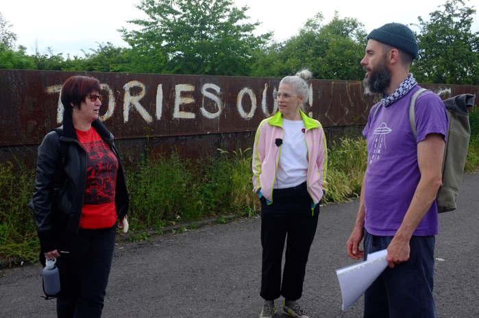 There are no signs to where we are going. We pass car mechanics and scaffolding centres with poles and planks painted bubble gum pink. Wild roses clamber through railings, elderflowers froth up around telegraph poles. The road is pitted, making hard work of the suitcase I’m pulling full of recording equipment. This, it turns out, is a no-through road and the closer we get to the barrier ahead the deeper the ruts and the larger the weeds that grow at its edges. We stop on a railway bridge, the sides of which are rusted and peeling with new and old graffiti in white and yellow. ‘Tories out’, reads one; ‘Scargill’, reads another.