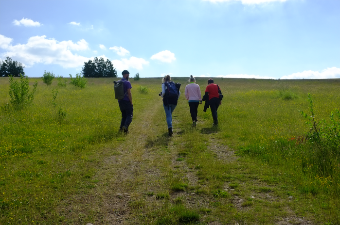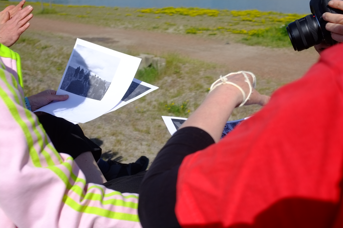 But how do we pass this thinking on, beyond here, beyond that moment, beyond this moment, beyond them, beyond us? We’re always asking, says Paula, what’s the exchange with the people and the place? And here we are, asking: What’s the exchange between the people and the place, and the artwork and the return to the artwork, now and then? There has been a lot of talk today. Words have a tendency to steal our attention but there have been other things too. A place of their own reference the traces of a place in our bodies...touching the ground...we asked them to breathe into it...thinking of the non-human witnesses and…non-human actors. And I turn to landscape as another participant: the tarmac that has loosened with age in gravelly clumps; the blades of grass trodden underfoot; the wooden bridge I trundle the suitcase of equipment over; the maroon marshy pond below; the copse of birches behind us that overhear our chatter; the shocking-blue damselfly that bounces on the air amid the grassy seed heads. They catch the light differently now.