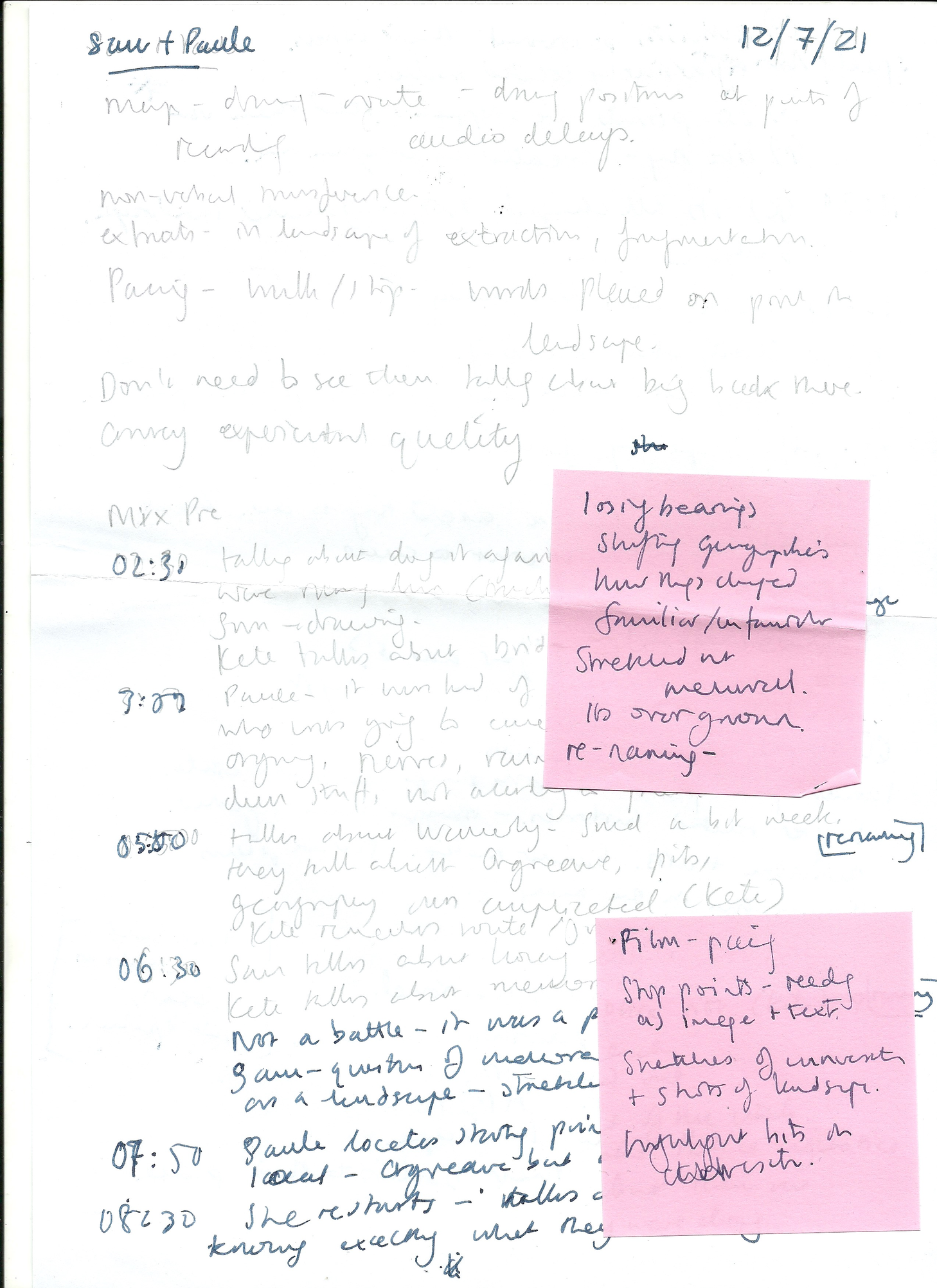 I wonder at the extracts that Paula and Sam read out; they call this speaking other people’s voices, bringing together different knowledges and experiences. Their voices dissipate on the breeze that brushes the meadow of the hill that we’re standing on, and that covers the ground beneath us and the seams of coal beneath that. I wonder at the passages of words I happen to pick out, that happen to strike me and recall the legacies of extraction that are at play on this site: the physical removal of earth and coal through industry; the physical removal of bodies by police violence; the traces of soil that we’ll carry home on our soles at the end of the day; the fragments of words spoken, scribbled, typed, ventriloquised, remembered, misheard, misunderstood, or heard only later through a breathy, windswept recording.