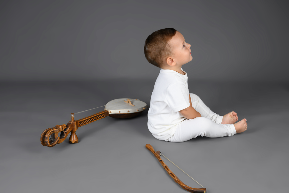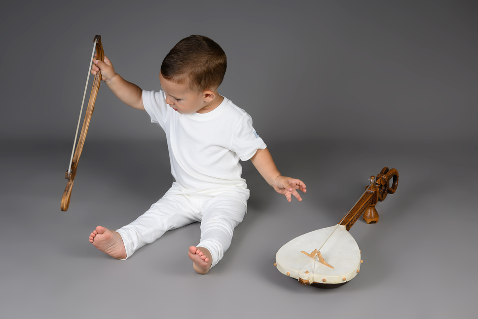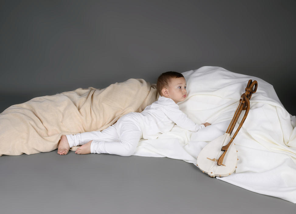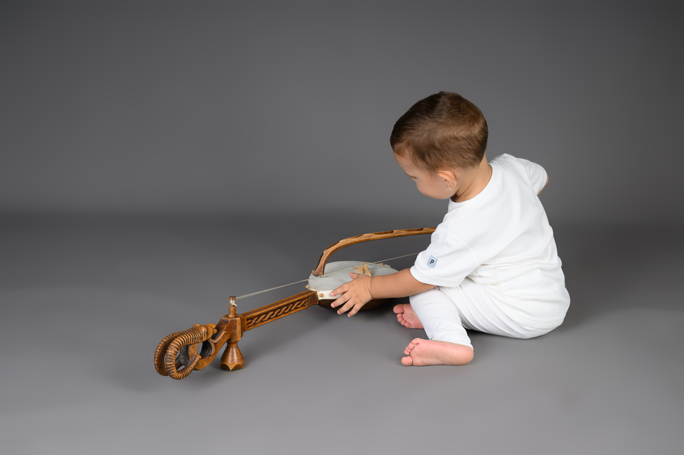 I arranged Bogdan’s first photo shoot on July 25th, 2023, in my hometown Kraljevo with a long-term collaborator Marko Živković. I bought a very nice white outfit in Helsinki, and we used Relja’s children’s gusle, originally made as a present for his second birthday. The very connection of both clothes and the instrument felt very appealing and symbolically tied to my artistic project. Along with Marko, we also had my mother Snežana, myself, and Nataša, the wife of a photographer, joined the photographing session. All three of us engaged Bogdan when, and where needed, with children’s music, our movements and talk. Bogdan was patient and behaving as a true model. Under the lights and with all the attention on him, he was collaborating to such a degree that there was clear that he enjoyed posing for the camera. Being a curious and fast toddler, it was striking to see him in action, as if he knew what to do. Seeing him holding the gusle, and realizing that the project is including his own presence in this way, made me truly happy and encouraged me to believe that the personal aspect and the future ’life’ of the music I’ve created go along. That day was one of my best memories throughout this project.